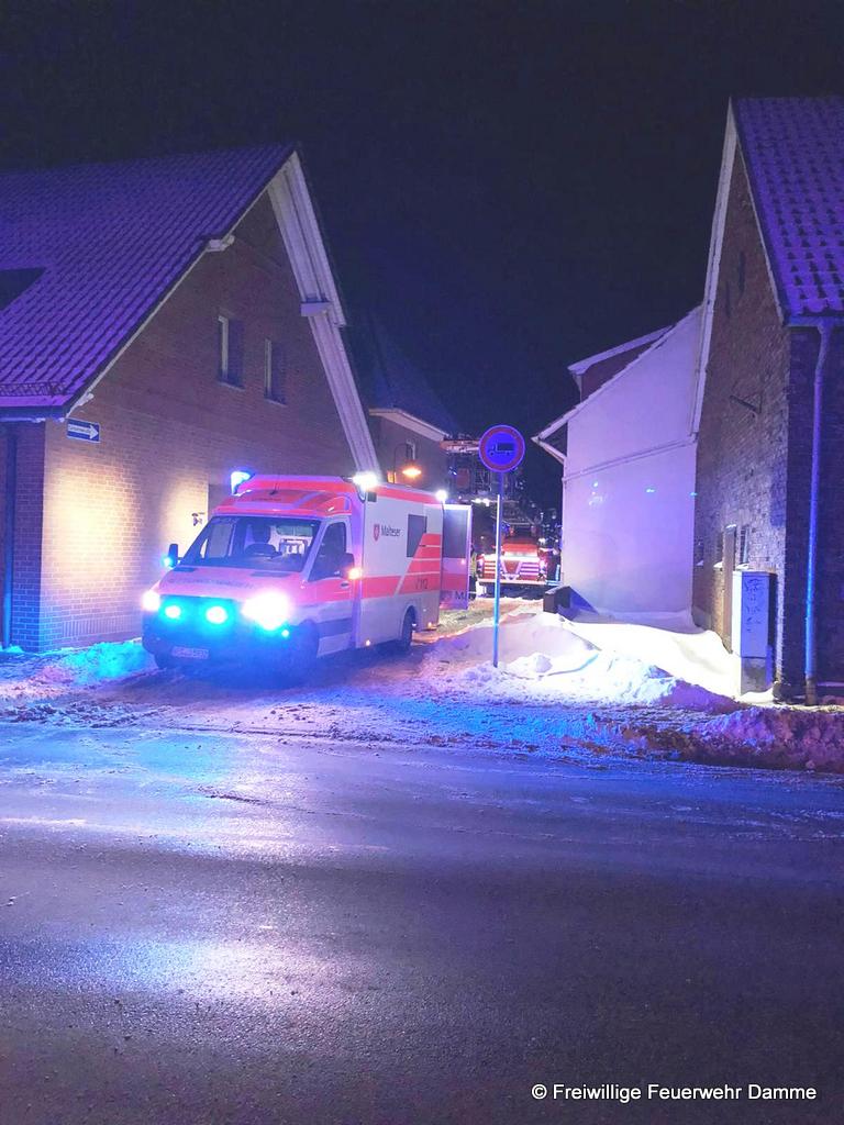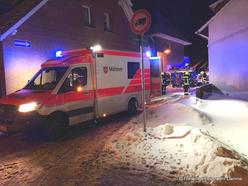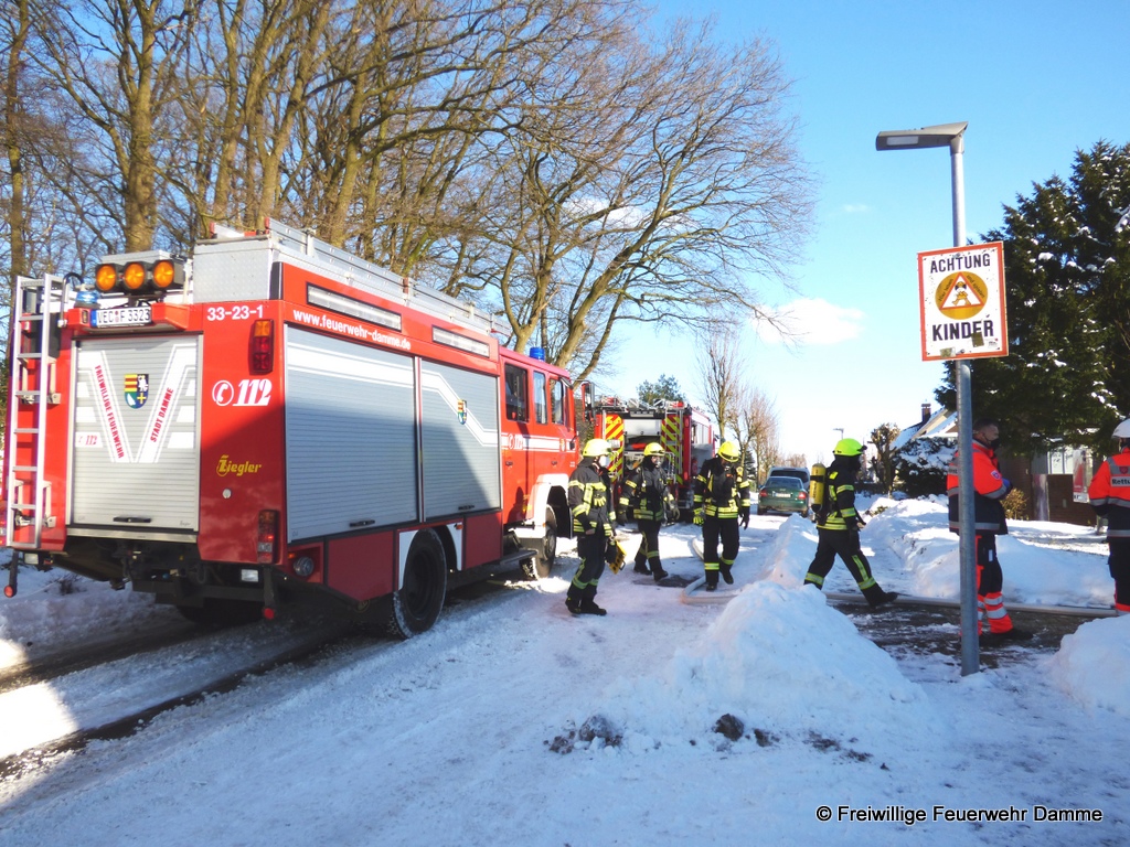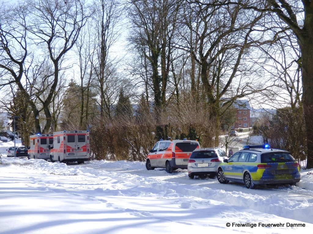 Im Einsatz: PKW Stv. OrtsBM, HLF 20, DLAK 23/12, TLF 16/25, RTW 2 Malteser Damme, RTW 3 Malteser Damme, NEF Malteser Damme, Polizei Damme