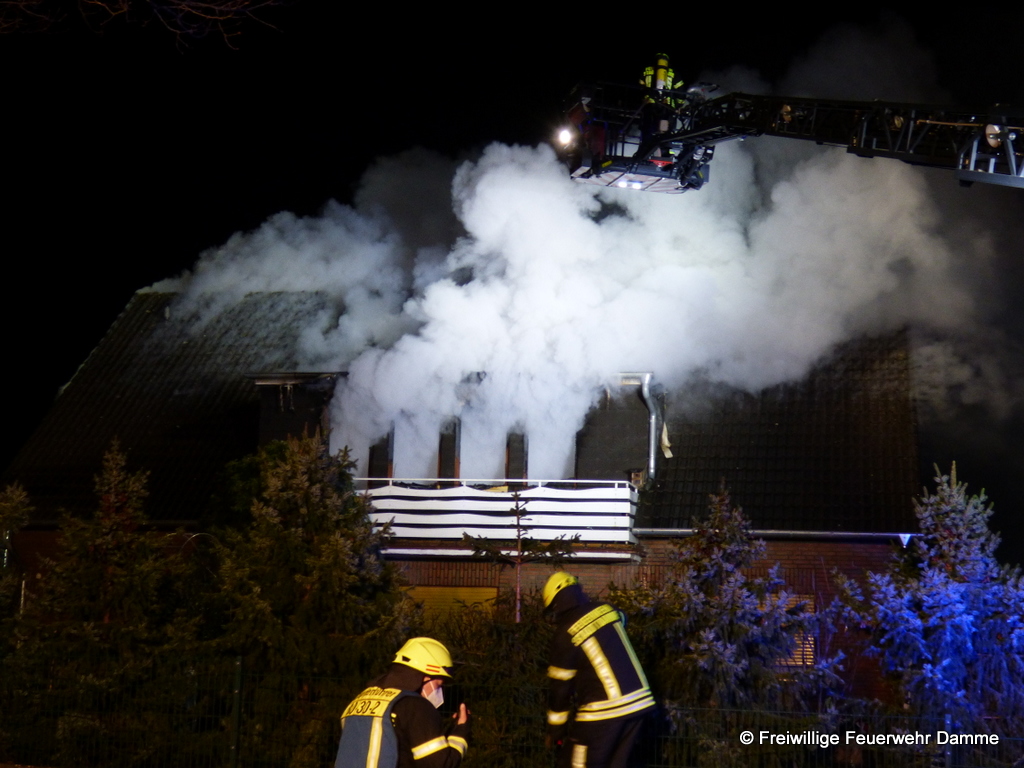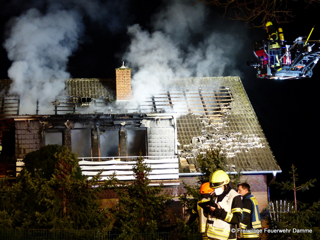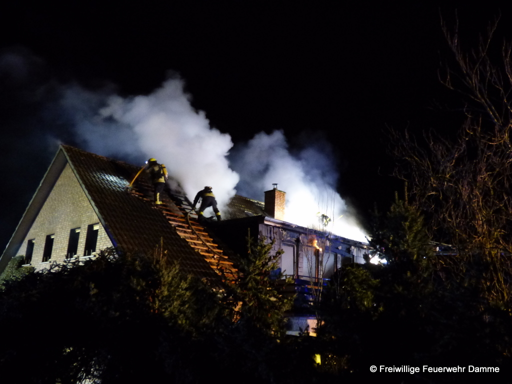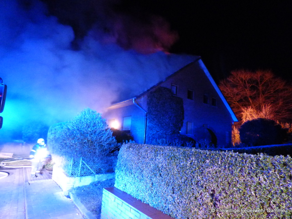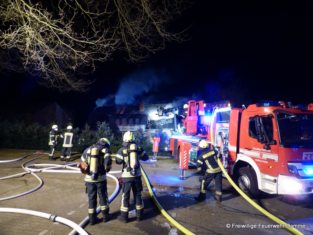 Beim Eintreffen der ersten Kräfte hatten die Bewohner glücklicherweise das Gebäude bereits unverletzt verlassen. Allerdings hatte das Feuer bereits auf den Dachstuhl übergegriffen. Daraufhin wurde vom Einsatzleiter umgehend auf Feuer 3 erhöht und die Feuerwehren Borringhausen und Osterfeine nachalarmiert. Um den Dachstuhlbrand von zwei Seiten effektiv zu bekämpfen, wurde zusätzlich die Drehleitereinheit der Feuerwehr Lohne alarmiert.