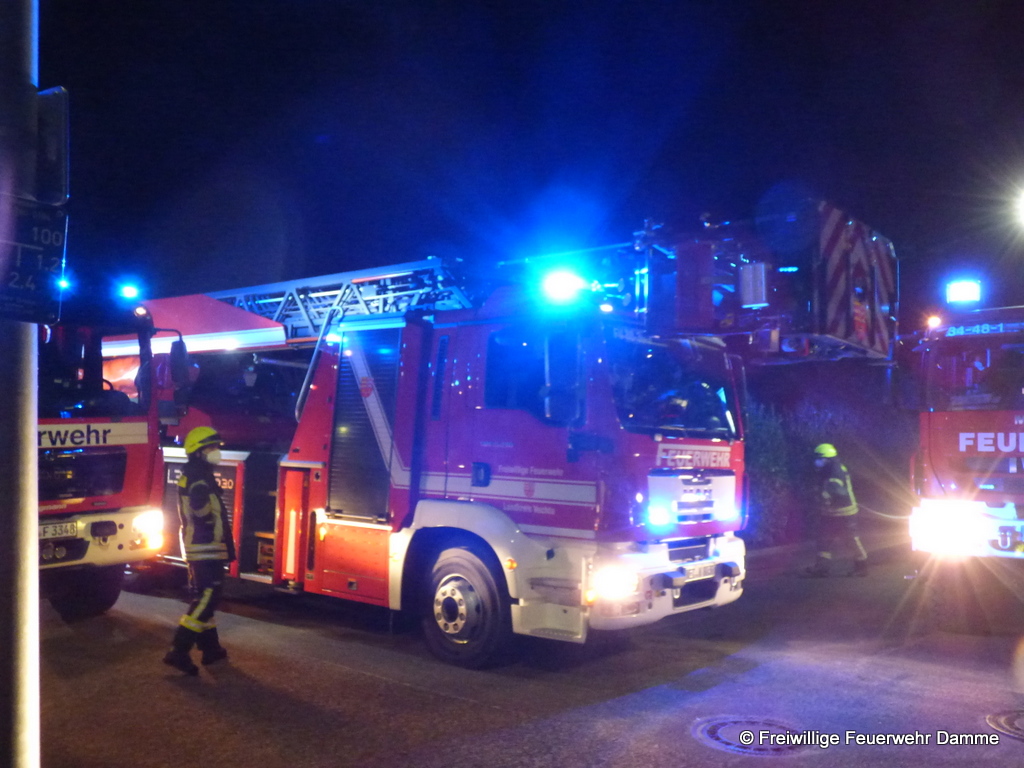 Im Einsatz: PKW OrtsBM, PKW Stv. OrtsBM, PKW Stv. StadtBM, HLF 20, DLAK 23/12, TLF 16/25, TLF 20/ 40 SL, ELW 1, MTF mit Materialanhänger, FF Borringhausen, FF Osterfeine, FF Lohne, AB Logistik FTZ LK Vechta, KBM LK Vechta, Stv. KBM LK Vechta/ Regierungsbrandmeister, RTW 1 Malteser Damme, RTW 2 Malteser Damme, NEF Malteser Damme, Polizei Damme