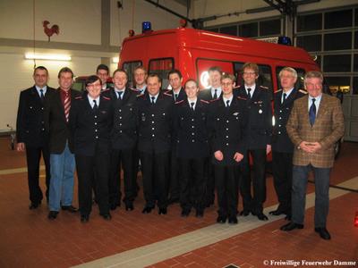 Stefan Scherwitzki zum Feuerwehrmann; Bianca Südkamp, Marcel Meyer, Stefan Hörstrup, Dennis Müller und Christoph Schmertmann zum Oberfeuerwehrmann-frau; Marion Südkamp zur Hauptfeuerwehrfrau; Sven Schröder und Uli Schumacher zum Oberlöschmeister. Jens Varenau wurde zur 25 jährigen Zugehörigkeit in der Feuerwehr Damme geehrt. Neu in die Feuerwehr wurden Heinrich Baune und Mario Benker aufgenommen. Sie stammen beide aus der Jugendfeuerwehr. Die Feuerwehr Damme gratuliert allen Beförderten und Geerten.