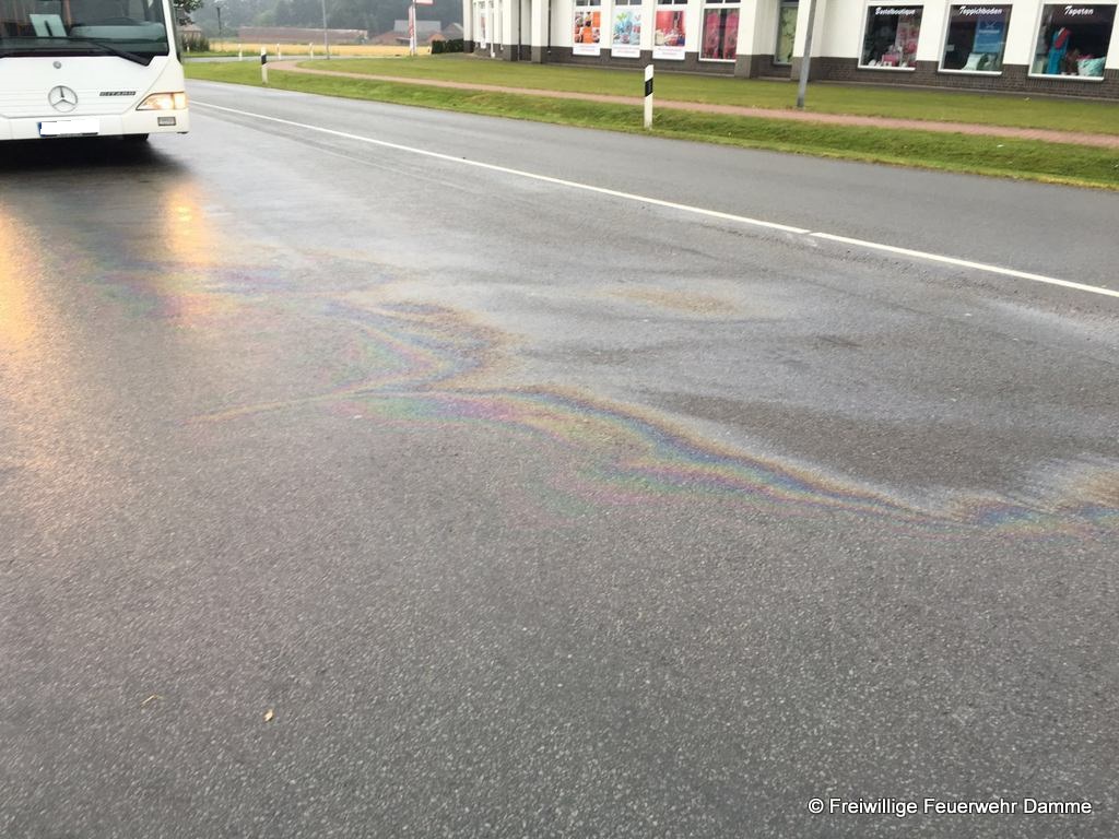 Um 06:59 wurde die Feuerwehr Damme zu einer technischen Hilfeleistung auf der Rottinghauser Str. in Damme West alarmiert. Ein Omnibus hatte von der Neuenwalder Straße über die Rottinghauser Straße bis zum Südring hin Getriebeöl verloren. Die Feuerwehr streute relevante Gefahrenstellen mit Bindemittel ab und stellte Ölwarnschilder auf. Die abschließende Reinigung der Straße wurde von einer Spezialfirma übernommen.
