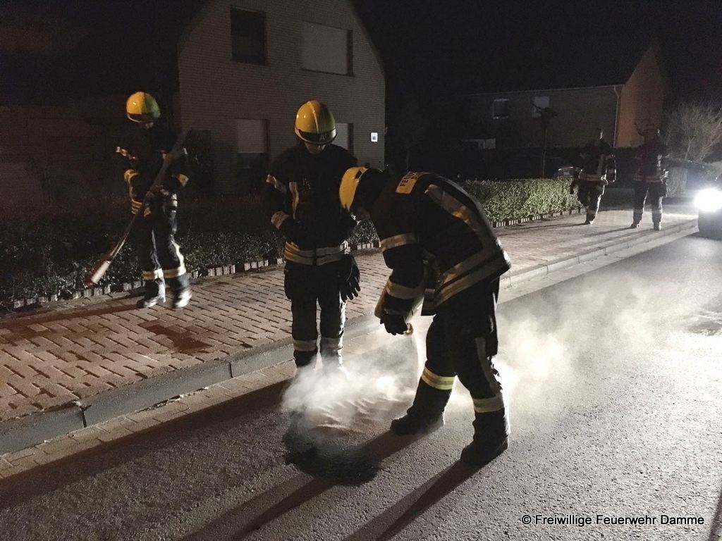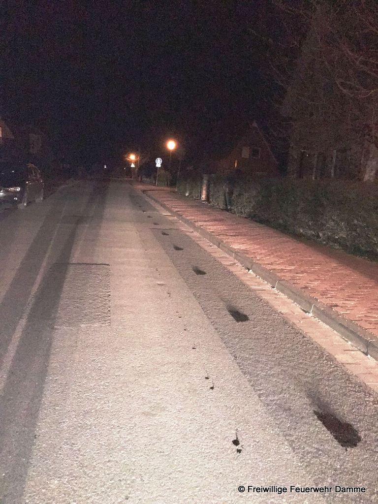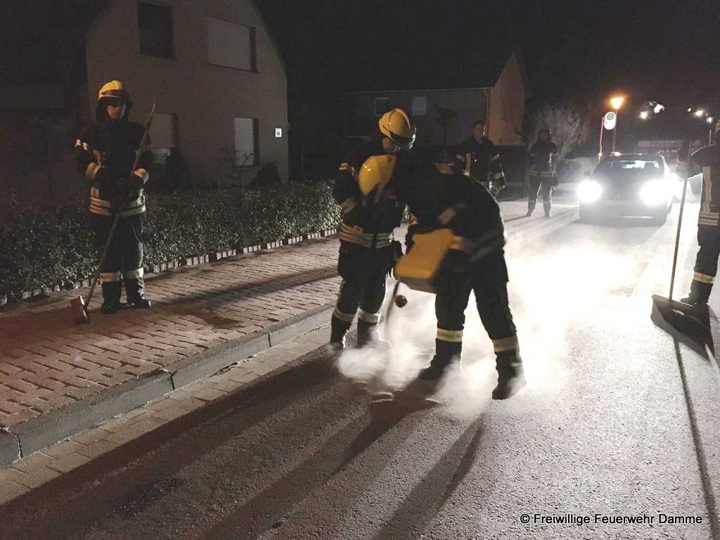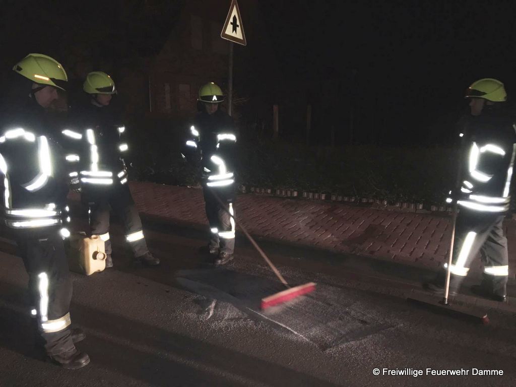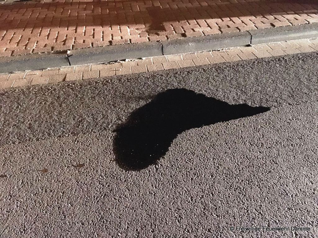 Um 22:48 wurde die Feuerwehr Damme zu einer technischen Hilfeleistung auf der Neuenwalder Straße in Clemens August Dorf alarmiert. Es wurde eine Ölspur von ca. 1 qm Größe mittels Bindemittel abgestreut und aufgenommen.