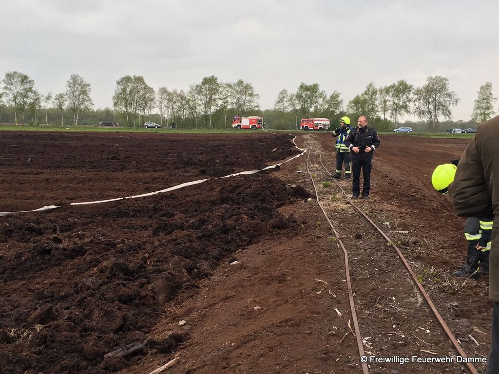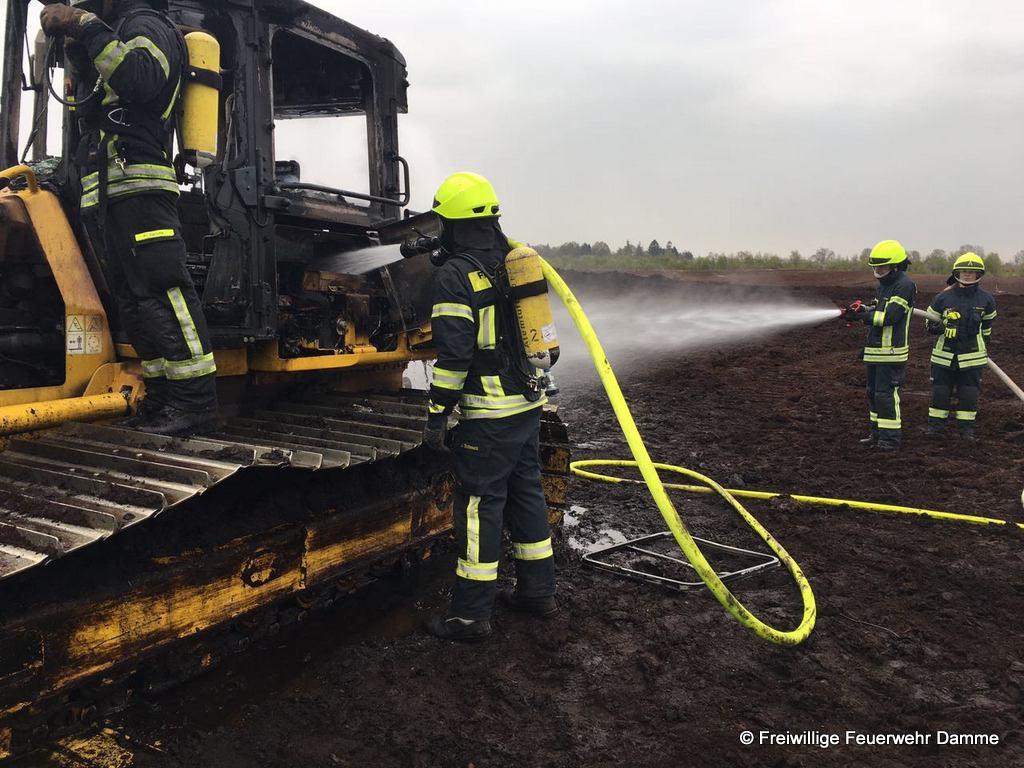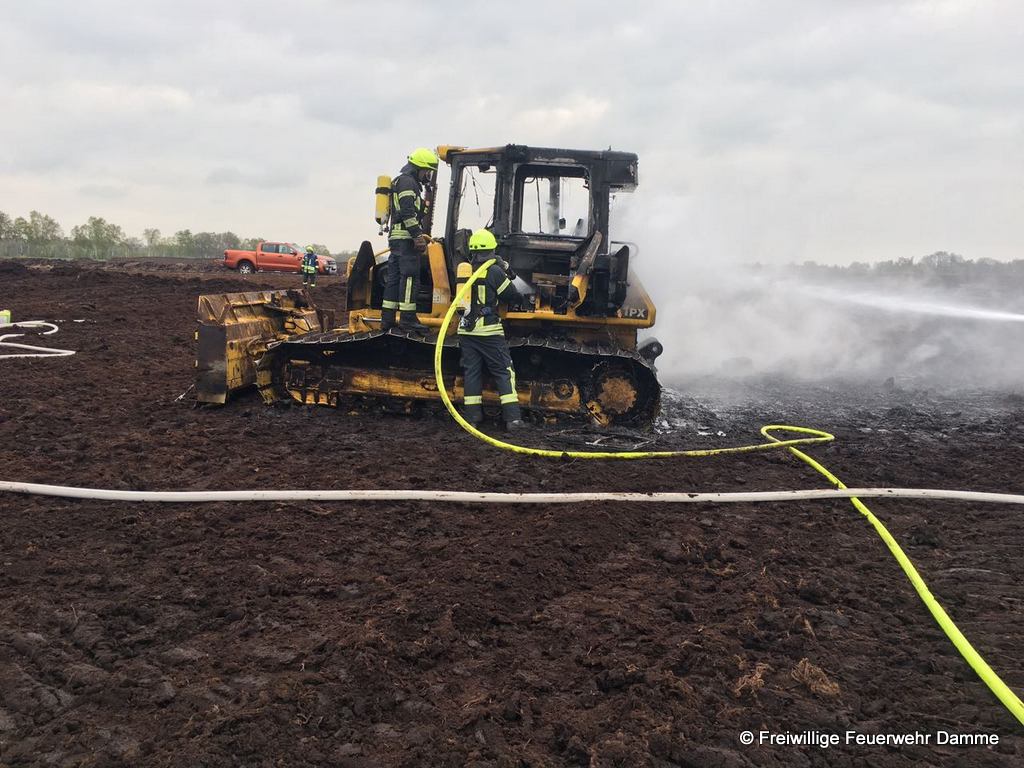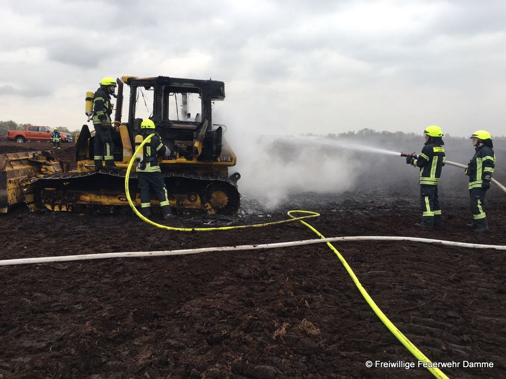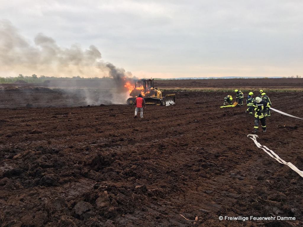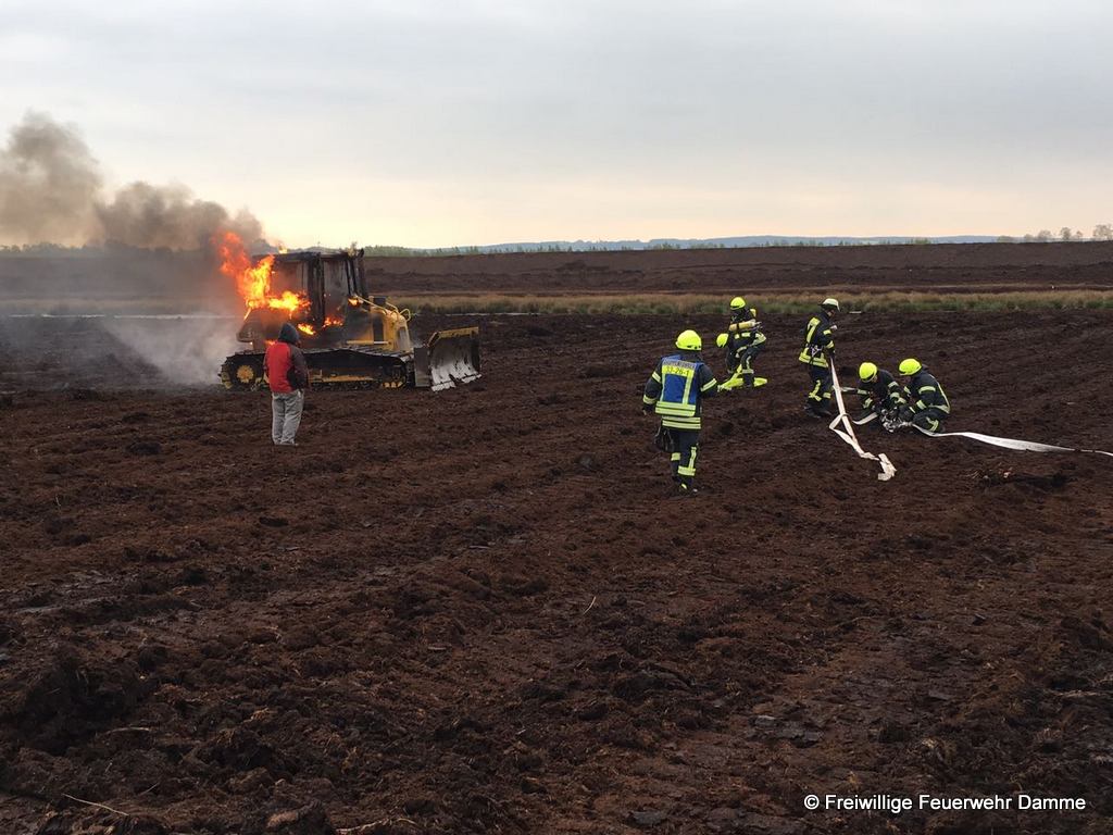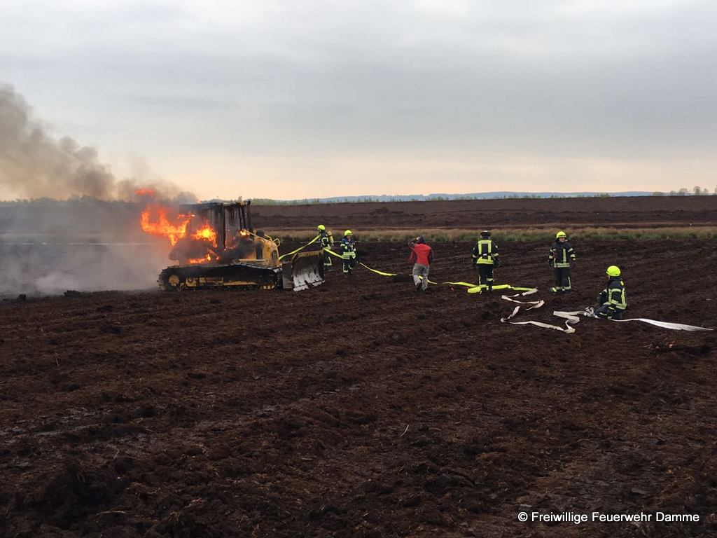 Um 14:35 wurde die Feuerwehr Damme zu einem Brand einer Planierraupe in Campemoor alarmiert. Beim Eintreffen der ersten Kräfte brannte die Raupe bereits in voller Ausdehnung. Erschwerend kam hinzu, dass sich die Einsatzstelle auf Torfabbaugebiet befand. Daher wurde sofort ein massiver Löschangriff vorgenommen um die brennende Raupe abzulöschen und ein Übergreifen auf das Moorgebiet zu verhindern.