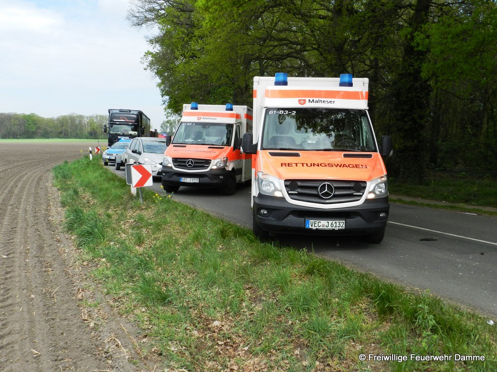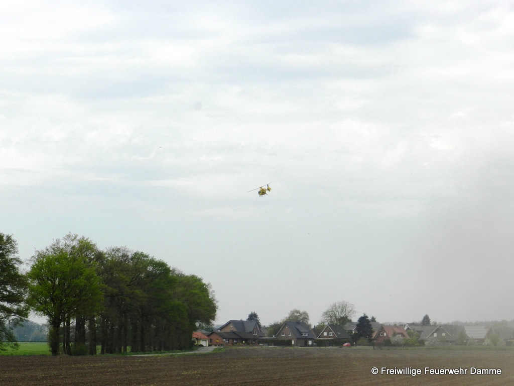 Im Einsatz: PKW OrtsBM, PKW Stv. OrtsBM, PKW Stv. StadtBM, TLF 16/ 25, LF 16 TS, ELW 1, MTF mit Materialanhänger, FF Borringhausen, FF Osterfeine, RTW 1 Malteser Damme, RTW 2 Malteser Damme, NEF Malteser Damme, RTH Christoph Euro 2, Polizei Damme.