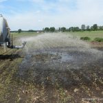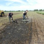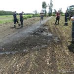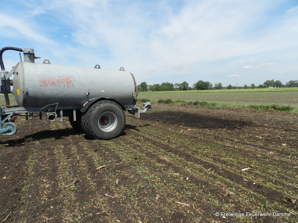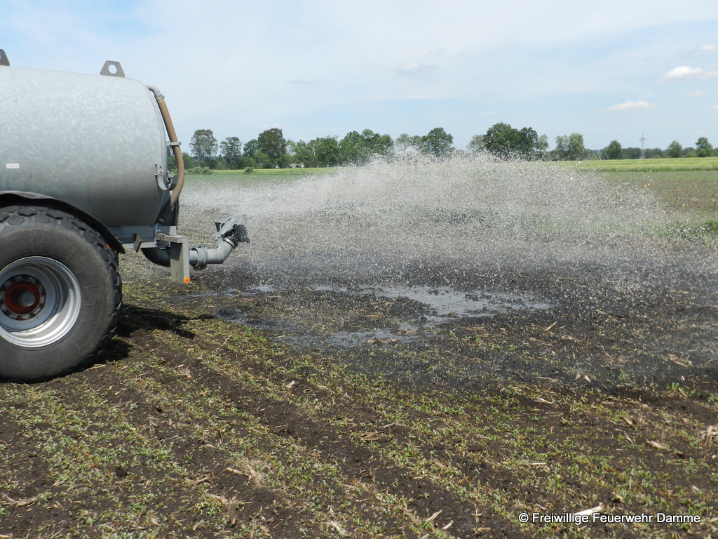 Auf Grund des moorigen Untergrundes war es nicht möglich, die ca. 300 Meter von befestigten Wegen befindliche Einsatzstelle mit den Tanklöschfahrzeugen der Feuerwehr anzufahren. Daher wurde die Brandfläche mit Forken umgegraben und mit Wasser aus dem 400 Liter fassenden Wassertank des Pflanzenschutz Spritzfahrzeuges abgelöscht. Anschließend wurde die Fläche noch von einem Traktor mit Güllefass, welches mit Wasser befüllt war, großflächig bewässert, um ein erneutes aufflammen zu verhindern.