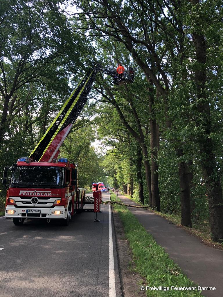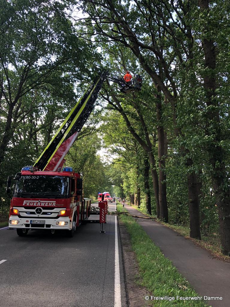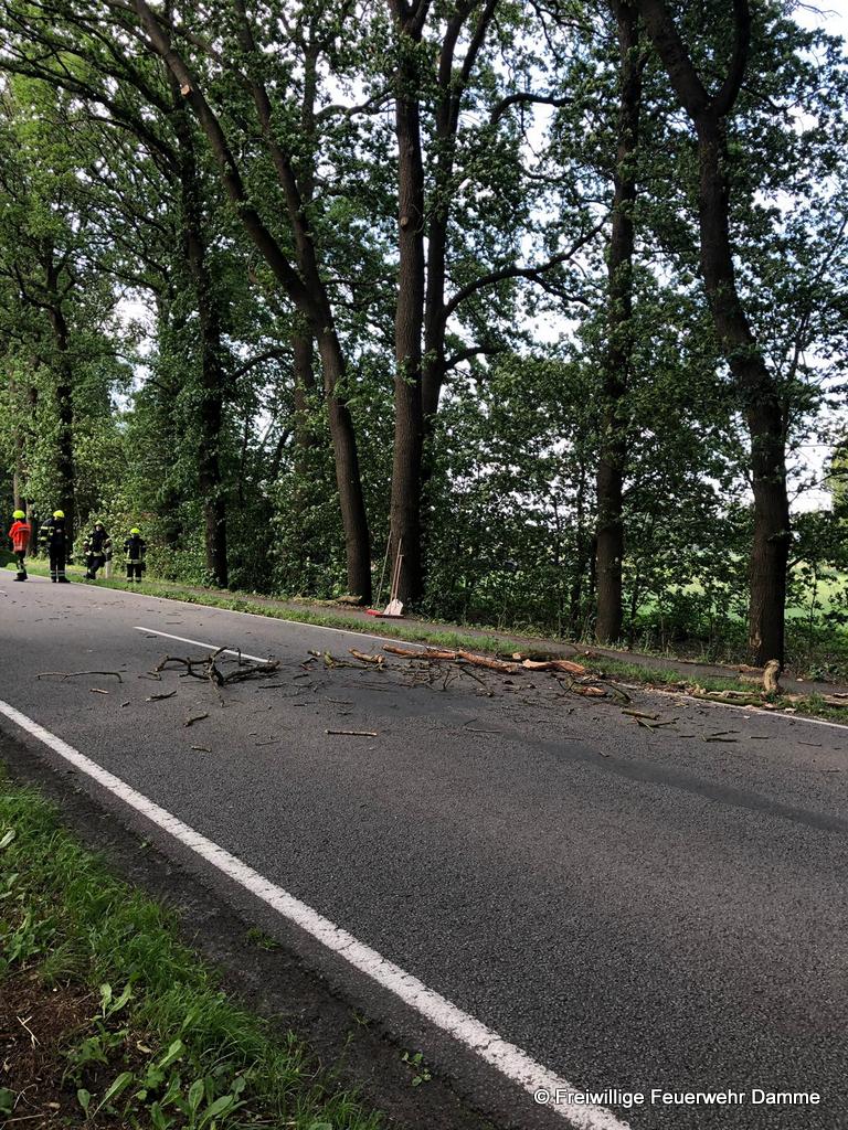 Um 16:10 wurde die Feuerwehr Damme zu einer technischen Hilfeleistung auf der Hunteburgerstraße in Südfelde alarmiert. In drei nebeneinanderstehenden Bäumen waren größerer Äste herausgebrochen und drohten auf die Straße zu fallen.