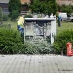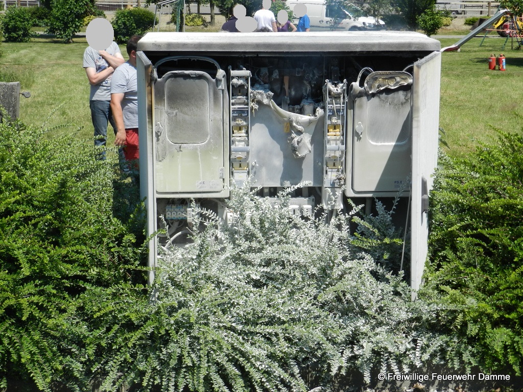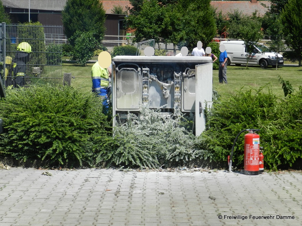 Um 12:48 wurde die Feuerwehr Damme, zusammen mit den Feuerwehren Borringhausen und Osterfeine, zu einem Brand eines Elektrokastens an der Dielinger Straße in Rüschendorf alarmiert. Beim Eintreffen der ersten Kräfte brannte ein Stromkasten einer Photovoltaikanlage in voller Ausdehnung.