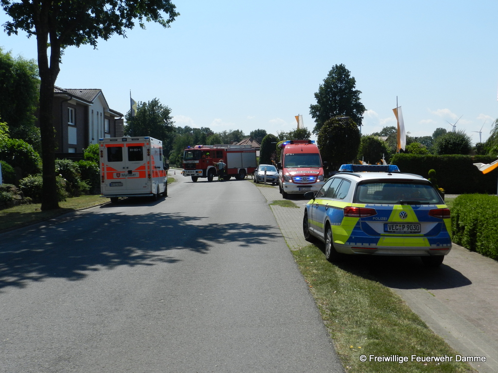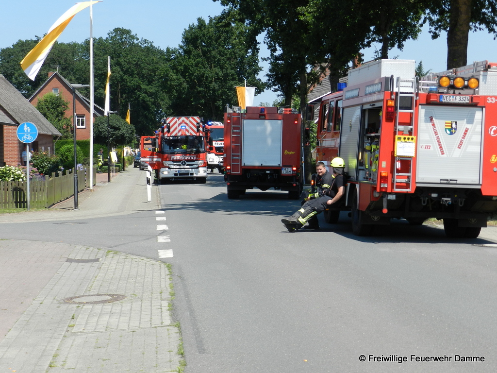 Im Einsatz: TLF 16/25, DLAK 23/ 12, LF 16 TS, TLF 20/ 40 SL ELW 1, FF Borringhausen, FF Osterfeine, RTW 1 Malteser Damme, Polizei Damme