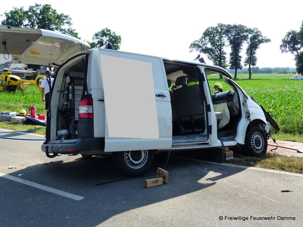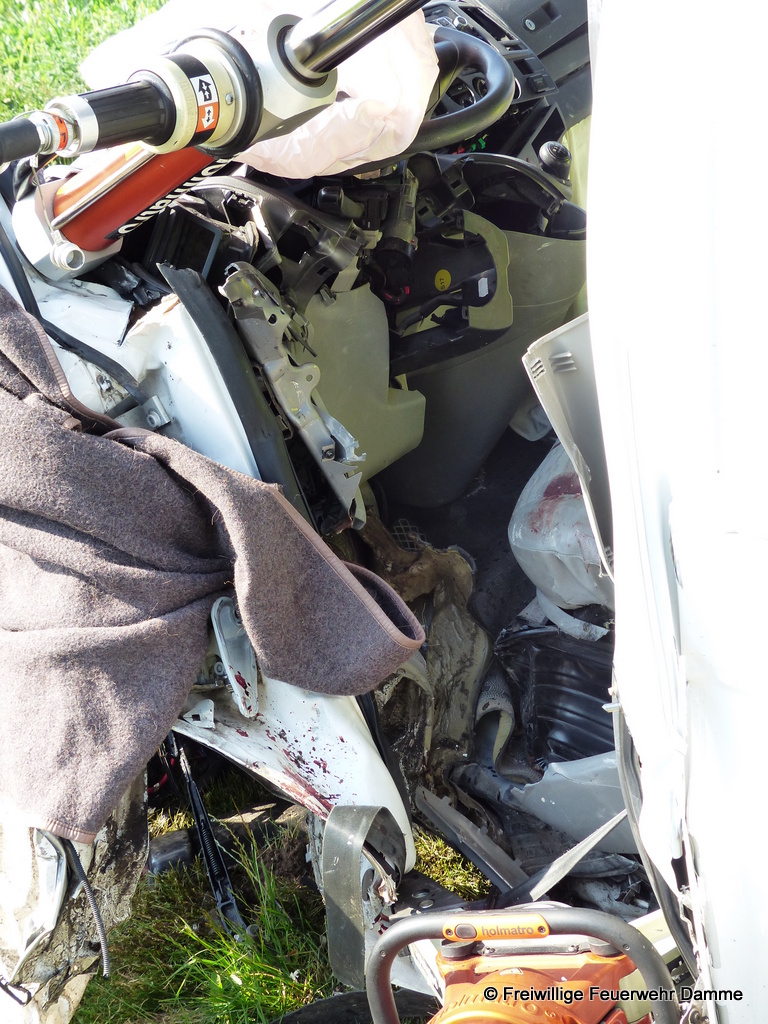 Nach der Befreiung der beiden Schwerverletzten Personen wurde, nach der Erstversorgung durch den Rettungsdienst, der Beifahrer zur weiteren Notfallversorgung zum Krankenhaus Damme gebracht. Der Fahrer wurde vom Rettungshubschrauber zum Marienhospital nach Osnabrück geflogen.