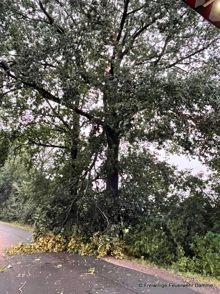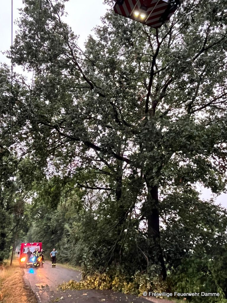 Auf der Straße Campemoor war ein größerer Ast aus einem Baum gebrochen und hing noch halb in der Krone drin. Von der Drehleiter aus konnte die Gefahrenstelle rasch beseitigt werden.