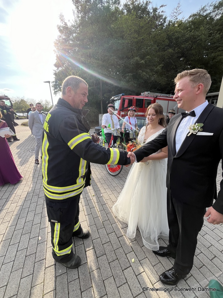 Aus diesem Grund wurde von den Kameraden der Feuerwehr Damme vor der Kirche mit einer Schlauchspirale Spalier gestanden. Außerdem wurde ihnen der St. Florian überreicht.