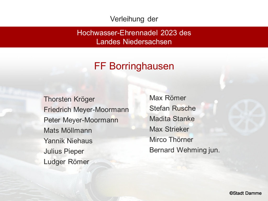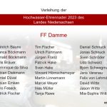 Am Dienstag den 30.09.2025 um 18 Uhr wurden im Feuerwehrhaus Damme 51 Kameradinnen und Kameraden der 3 Dammer Ortswehren Damme, Borringhausen und Osterfeine mit der Niedersächsischen Hochwasser-Ehrennadeln ausgezeichnet.