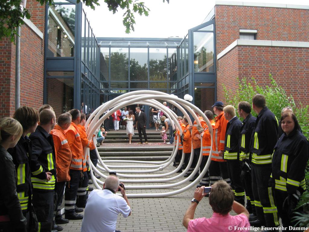 Am 08.08.08 hat unser Feuerwehrkamerad Sven Schröder sein Freundin Anita Jäger geheiratet. Aus diesem Grund wurde von der Feuerwehr Damme, zusammen mit den ehemaligen Kameraden der Feuerwehr Lohne und den Arbeitskollegen der Malteser Damme, vor dem Standesamt im Dammer Rathaus Spalier gestanden. Wir wünschen ihm und seiner Frau für die Zukunft alles Gute.