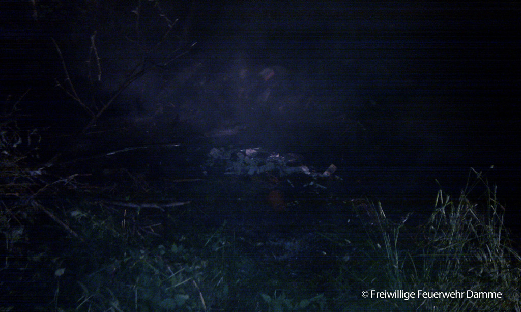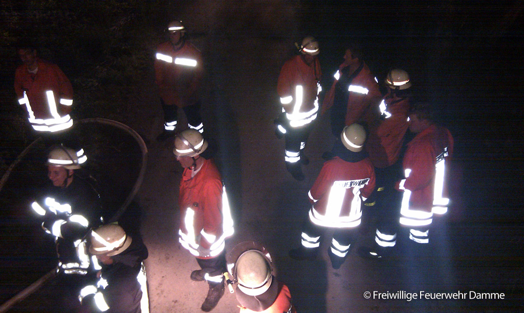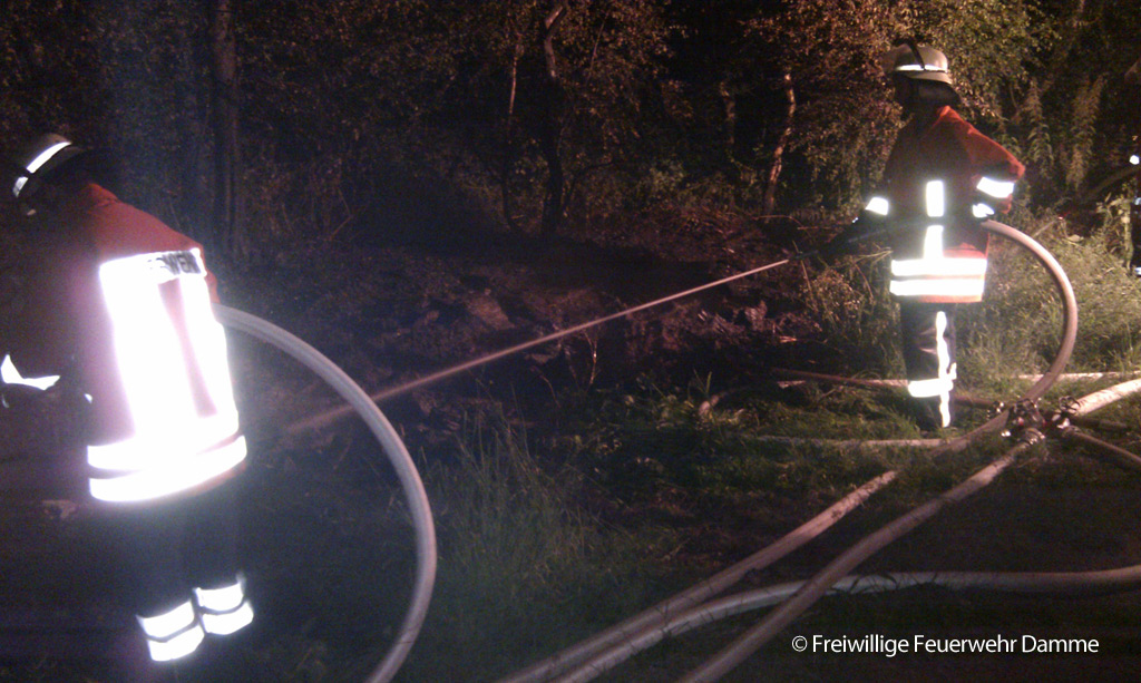 Um 22:58 wurde die Feuerwehr Damme erneut zusammen mit den Feuerwehr Borringhausen zu einem Brand in Rüschendorf alarmiert. Im Hüder Moor war es zum einem Brand in einem kleinen Waldstück gekommen.