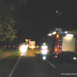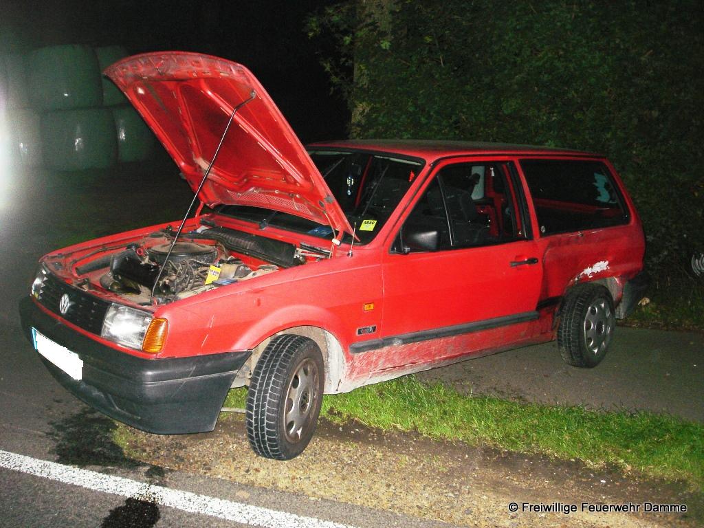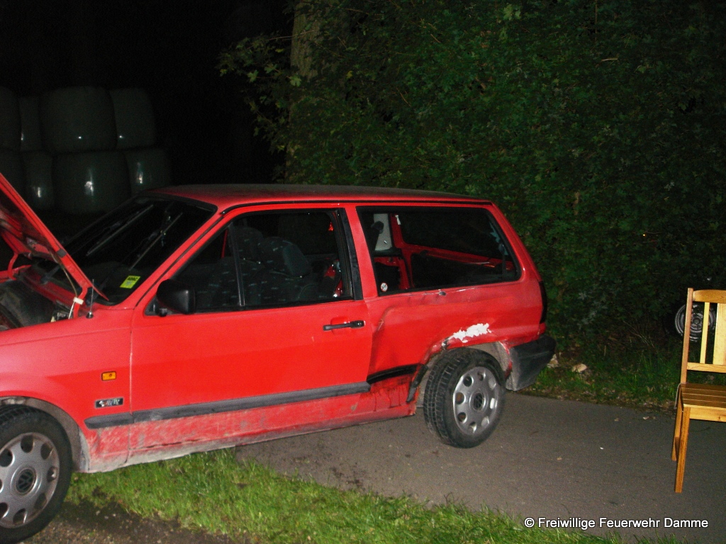 Um 22:19 wurde die Feuerwehr Damme zu einem Verkehrsunfall mit eingeklemmter Person auf der Hunteburger Str. in Südfelde alarmiert. Gemeldet war das ein PKW unter einen LKW gefahren sei. Vor Ort stellte sich jedoch heraus, dass ein PKW und LKW zusammengestoßen waren, der PKW dabei von der Strasse geschleudert wurde und niemand im Fahrzeug eingeklemmt war. Die PKW Fahrerin wurde leichtverletzt ins Dammer Krankenhaus gebracht. Der LKW Fahrer blieb unverletzt.