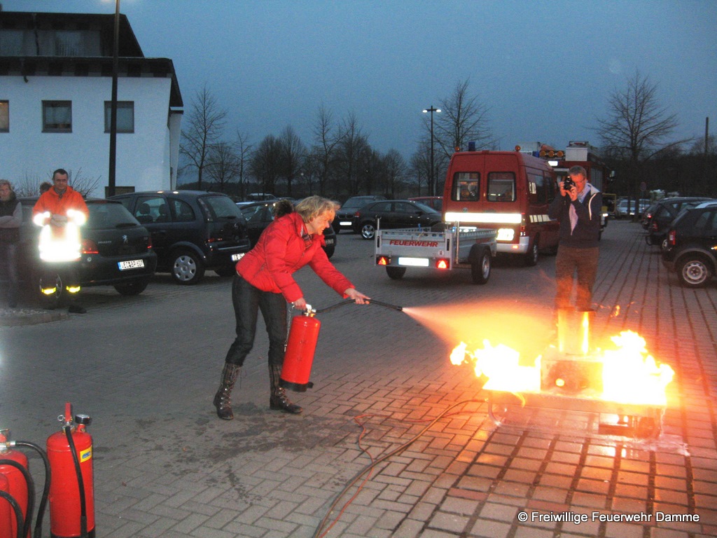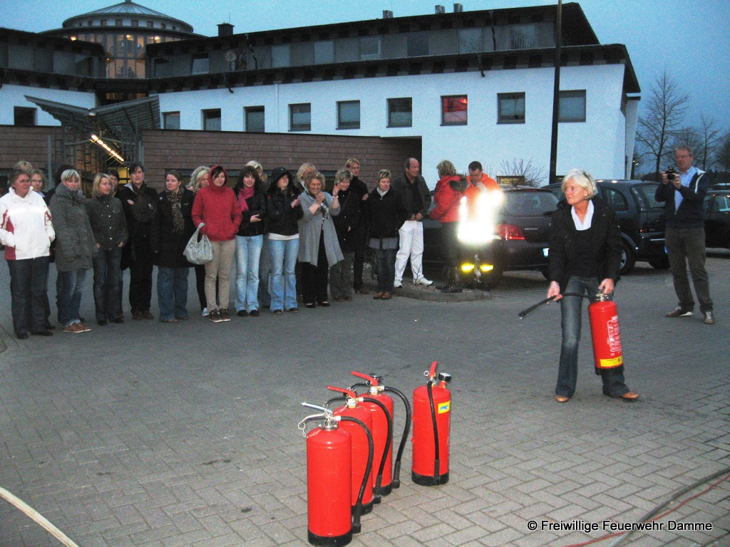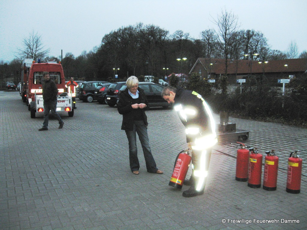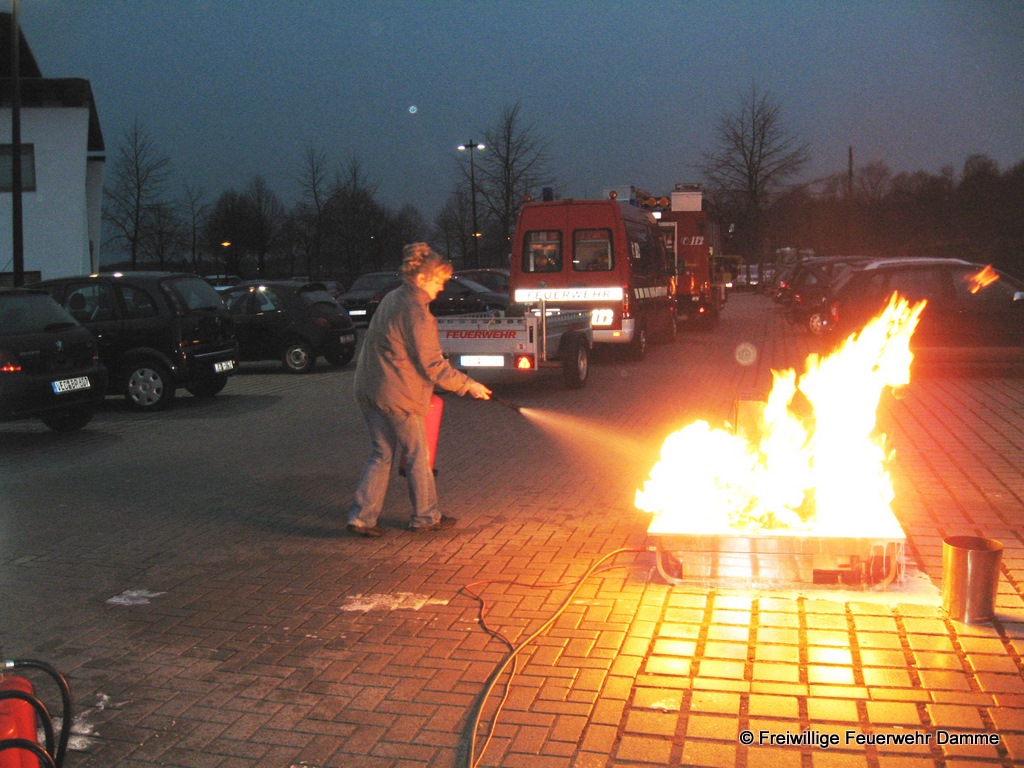 Im Rahmen einer Brandschutzunterweisung wurden die Ärzte und Arzthelferinnen des Gesundheitszentrums Damme von der Feuerwehr Damme geschult. Es wurde das richtige Verhalten und Handeln bei einem Brandausbruch erläutert. Ferner wurde auf den vorbeugenden Brandschutz im Ärztehaus hingewiesen. Anschließend wurde der richtige Umgang mit einem Feuerlöscher gezeigt. Dabei hatte jeder Teilnehmer die Möglichkeit, einmal praktisch mit einem Feuerlöscher ein Feuer zu löschen. Insgesamt wurden ca. 25 Personen von den Kameraden Hans Malik, Lars Böckmann, Mario Benker und Jürgen Franz geschult. Die Dauer der Schulung betrug 2 Stunden.
