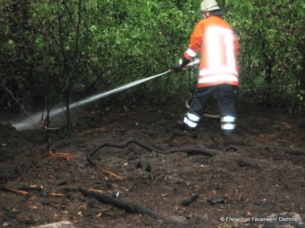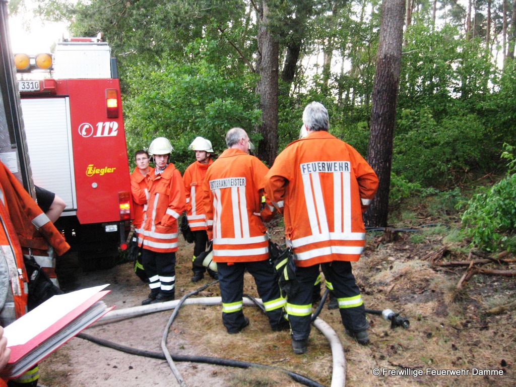 Um 20:04 wurde die Feuerwehr Damme zu einer nachbarschaftlichen Löschhilfe in Grapperhausen alarmiert. In einem Waldstück nahe der Autobahn war es zu einem Brand einer ca. 20 x 30 Meter großen Fläche gekommen. Auf Grund der extremen Trockenheit und weil der Brandort weit ab von der nächsten Wasserversorgung lag, wurden von der Leitstelle gleich 4 Feuerwehren alarmiert. Ihnen gelang es, das Feuer rasch zu löschen und ein weiteres ausbreiten auf den restlichen Wald zu verhindern.