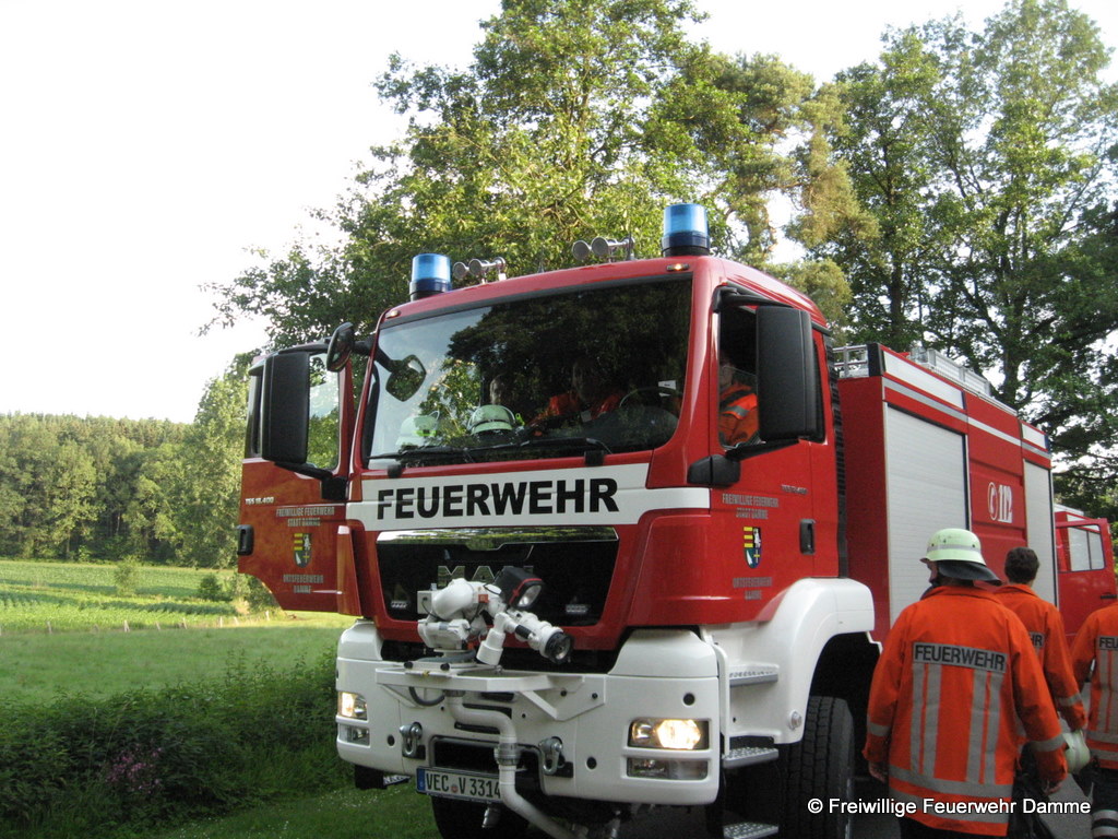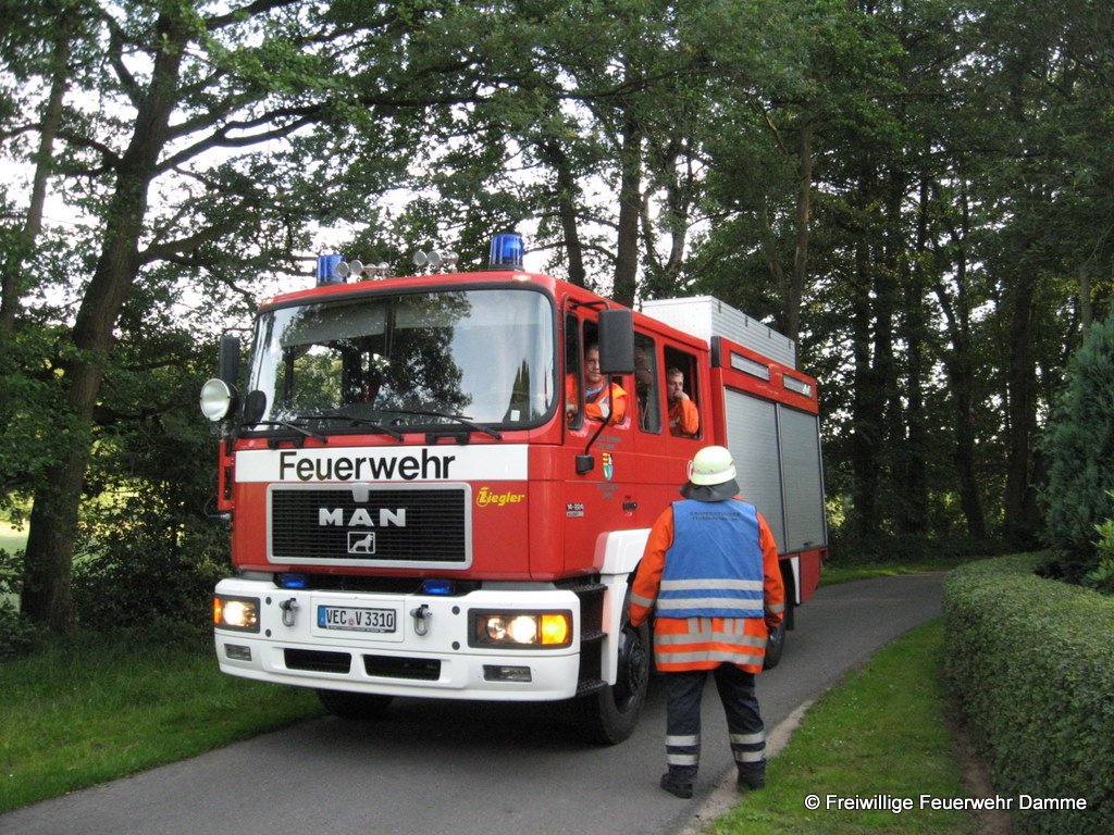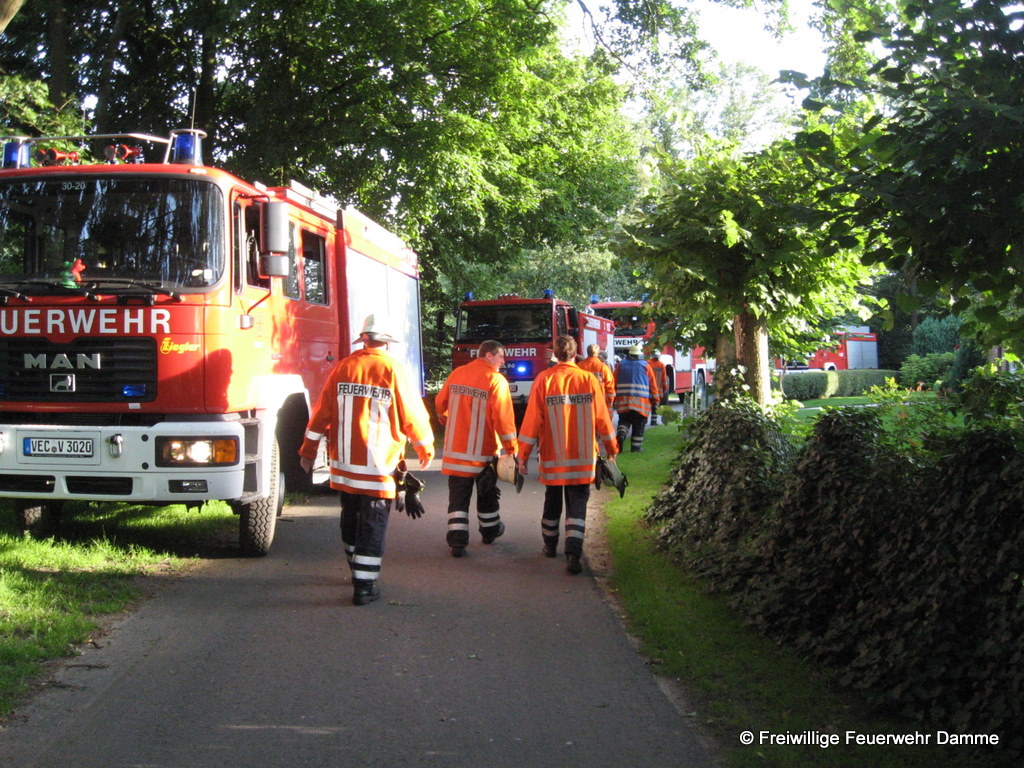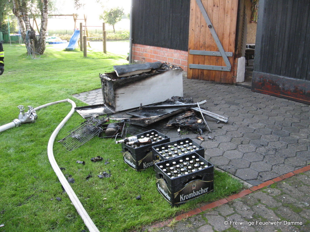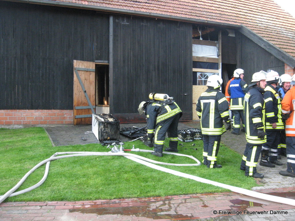 Um 19:39 wurde die Feuerwehr Damme zu einer nachbarschaftlichen Löschhilfe in Handorf alarmiert. Gemeldet war ein Scheunenbrand in Handorf, an der Dersaburg. Beim Eintreffen der ersten Kräfte brannte ein Kühlschrank in der Scheune. Er konnte zügig abgelöscht und ein Übergreifen der Flammen auf die Scheune verhindert werden.