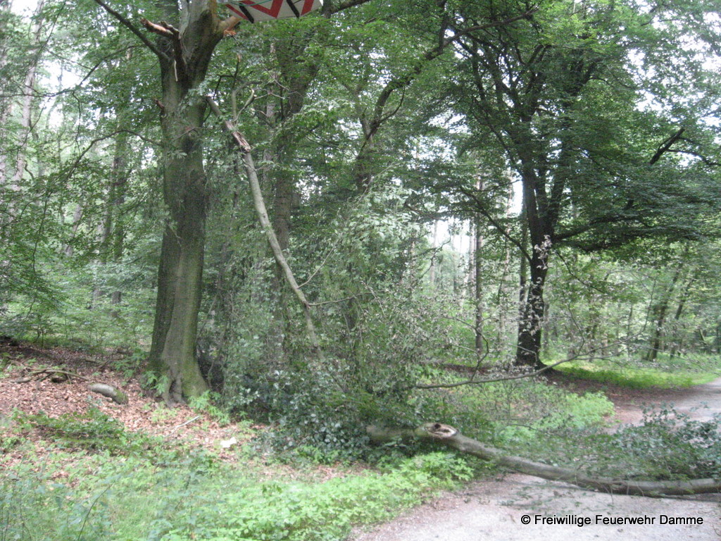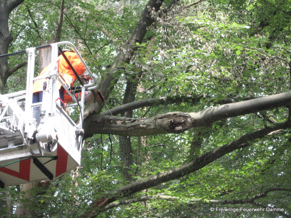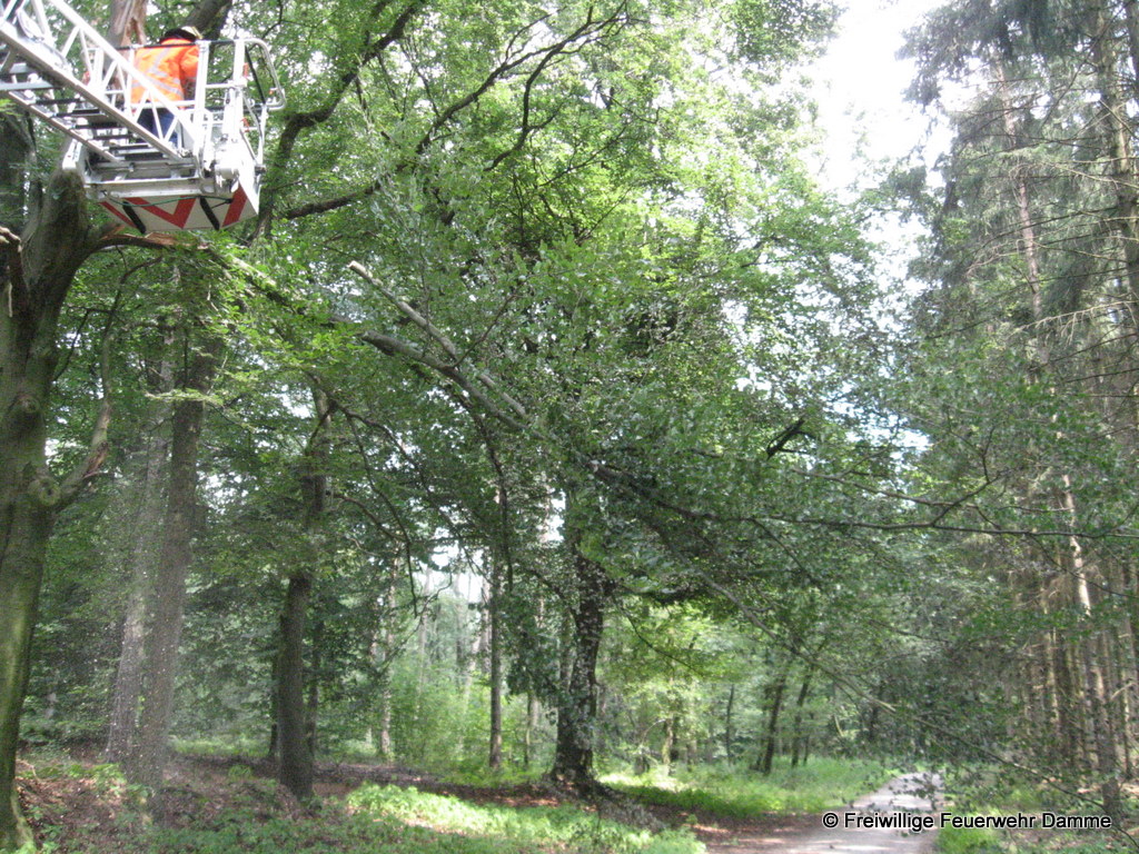 Zu einer technischen Hilfeleistung in der Bexadde rückte die Feuerwehr Damme um 13:14 aus. In dem Wald hinter der Realschule Damme drohte ein abgebrochener Ast auf eine Nordic-Walking Strecke zu stürzen. Um keinen Spaziergänger oder Sportler zu gefährden wurde die Gefahrenstelle von der Feuerwehr mittels Drehleiter beseitigt.