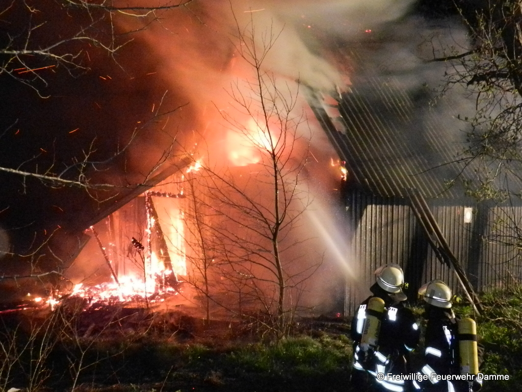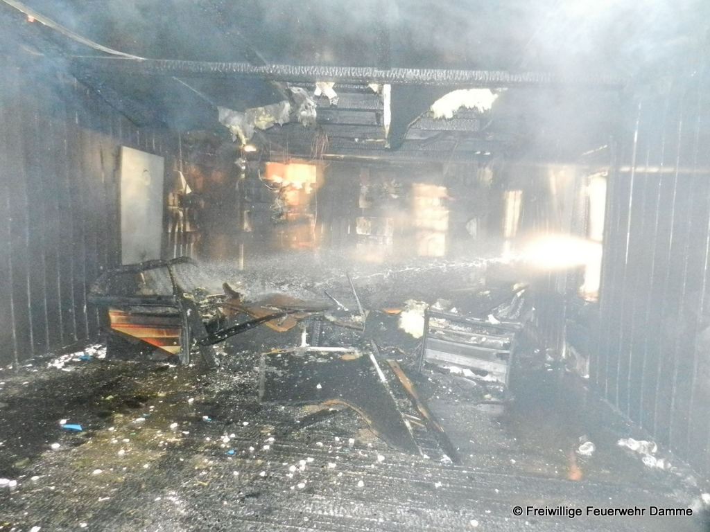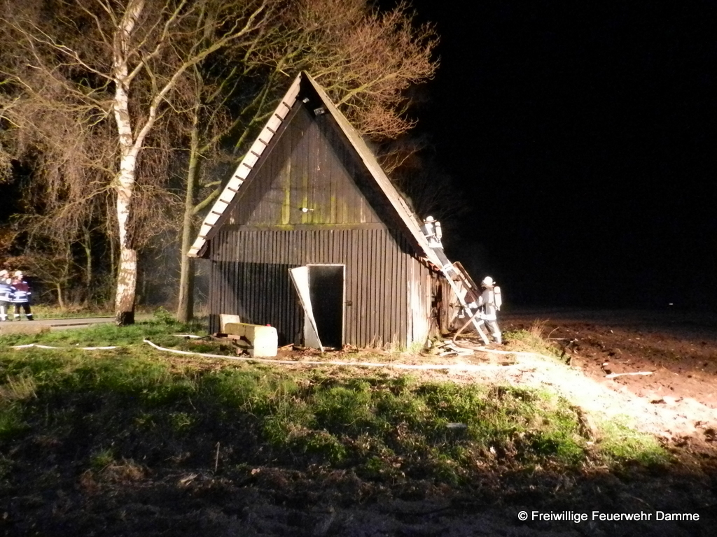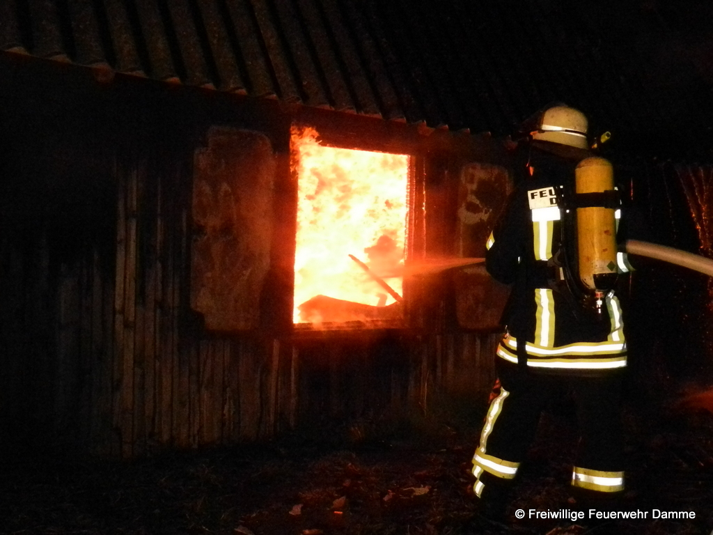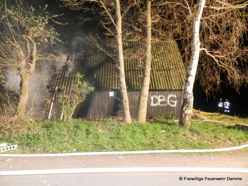 Um 01:12 wurde die Feuerwehr Damme zu einem Brandeinsatz in Sierhausen alarmiert. In der Nähe der Römerschanzen brannte eine ehemalige Partyhütte. Das Feuer breitete sich schnell über den Dachstuhl auf das gesamte Gebäude aus. Mit zwei Angrifftrupps wurde das Feuer von außen bekämpft. An dem leerstehenden Gebäude entstand Totalschaden. Als Brandursache kann Brandstiftung nicht ausgeschlossen werden. Die Kripo hat die Ermittlungen aufgenommen.