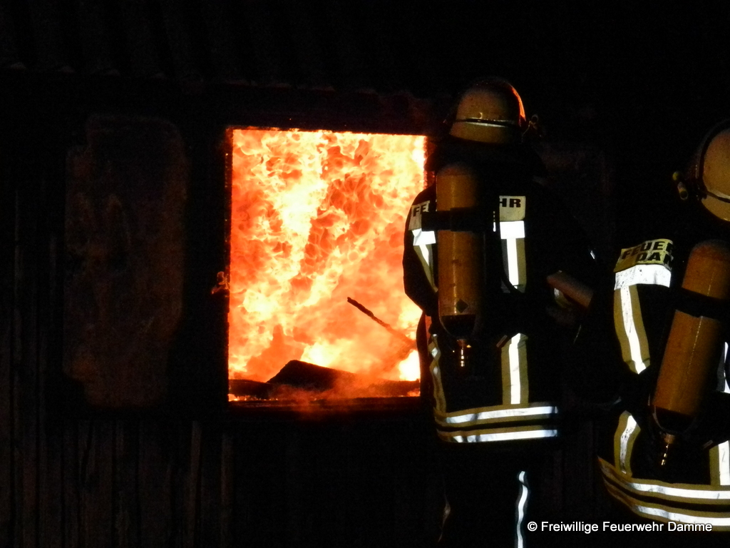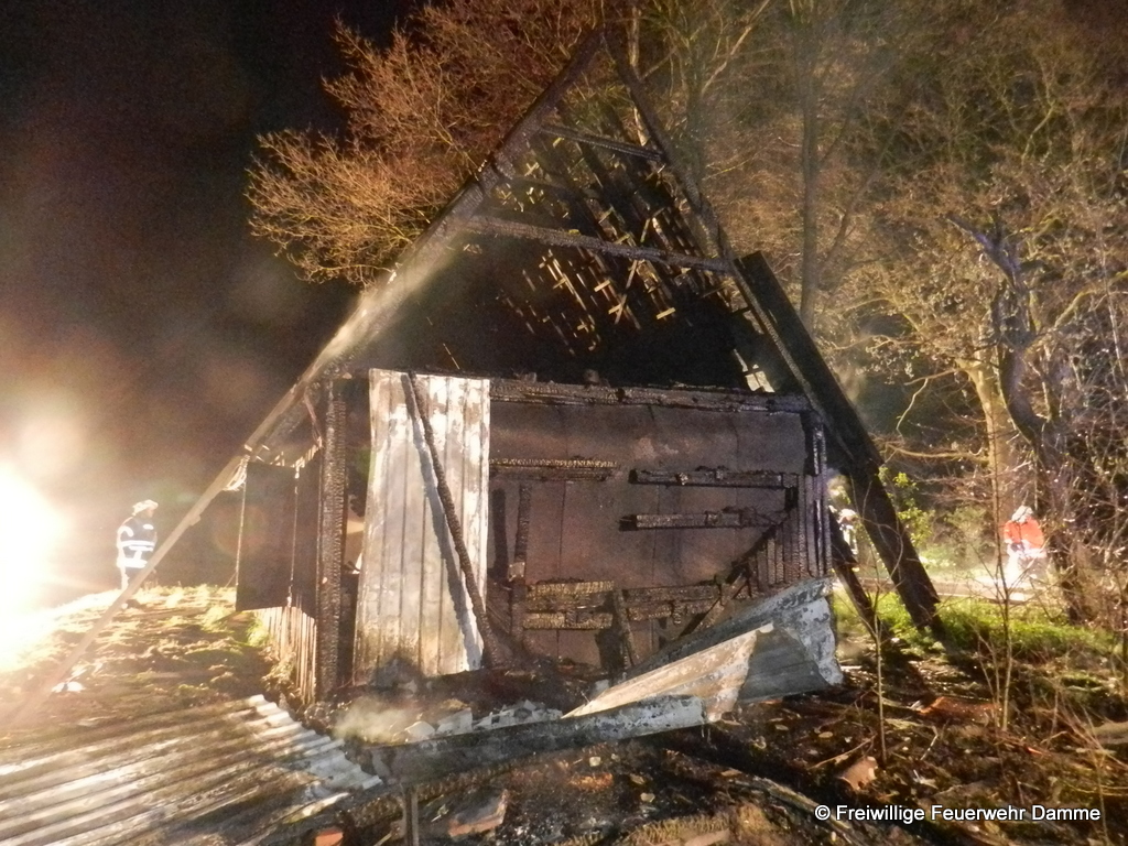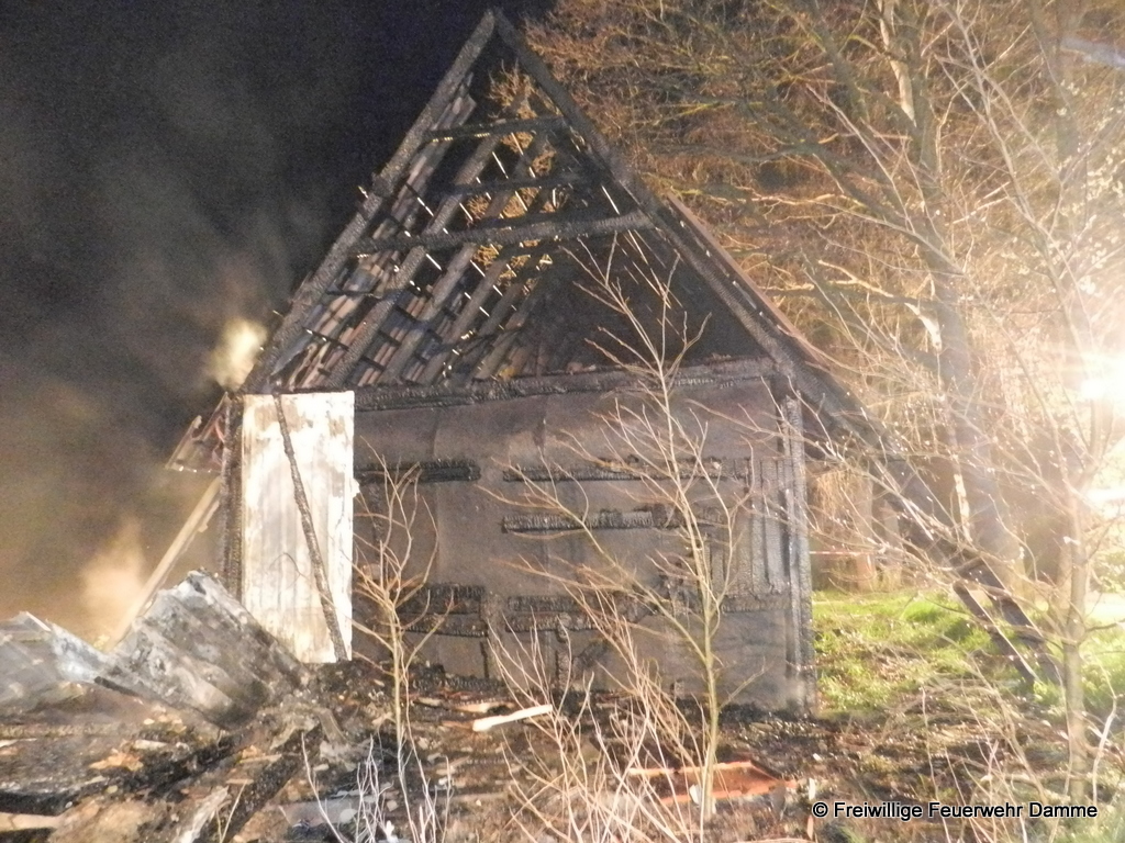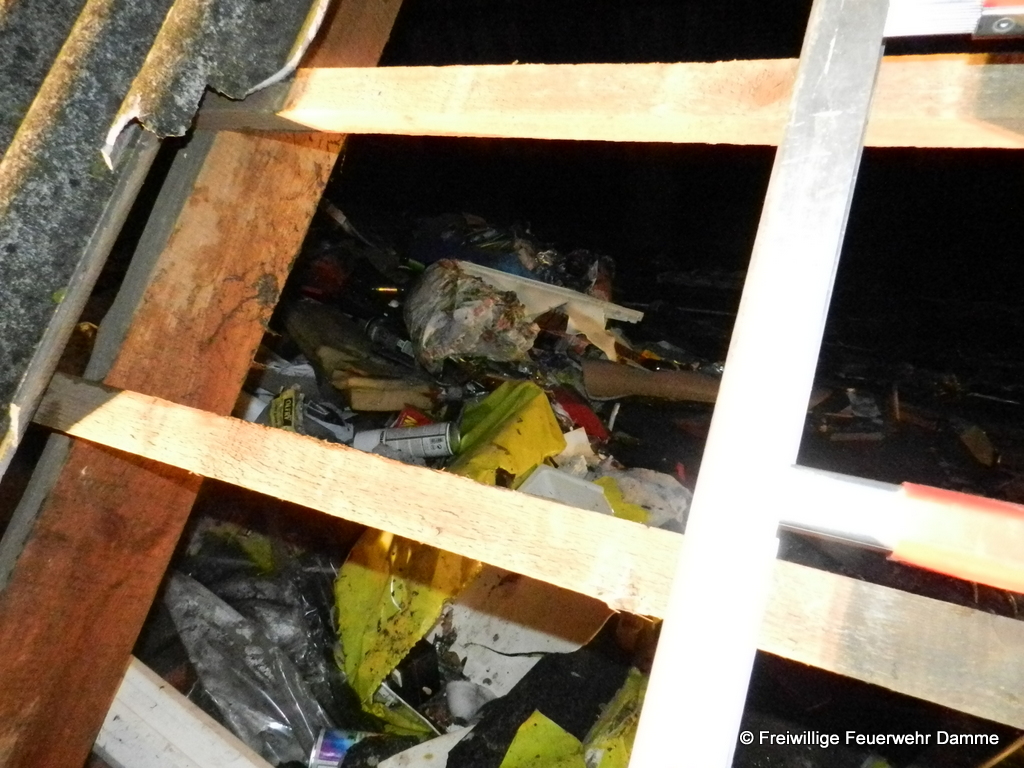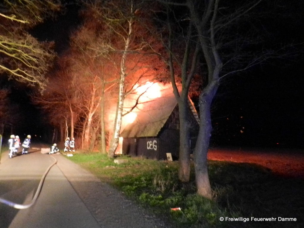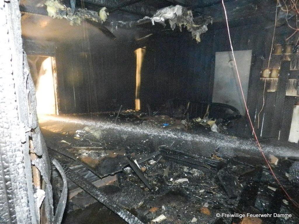 Um 01:12 wurde die Feuerwehr Damme zu einem Brandeinsatz in Sierhausen alarmiert. In der Nähe der Römerschanzen brannte eine ehemalige Partyhütte. Das Feuer breitete sich schnell über den Dachstuhl auf das gesamte Gebäude aus. Mit zwei Angrifftrupps wurde das Feuer von außen bekämpft. An dem leerstehenden Gebäude entstand Totalschaden. Als Brandursache kann Brandstiftung nicht ausgeschlossen werden. Die Kripo hat die Ermittlungen aufgenommen.
