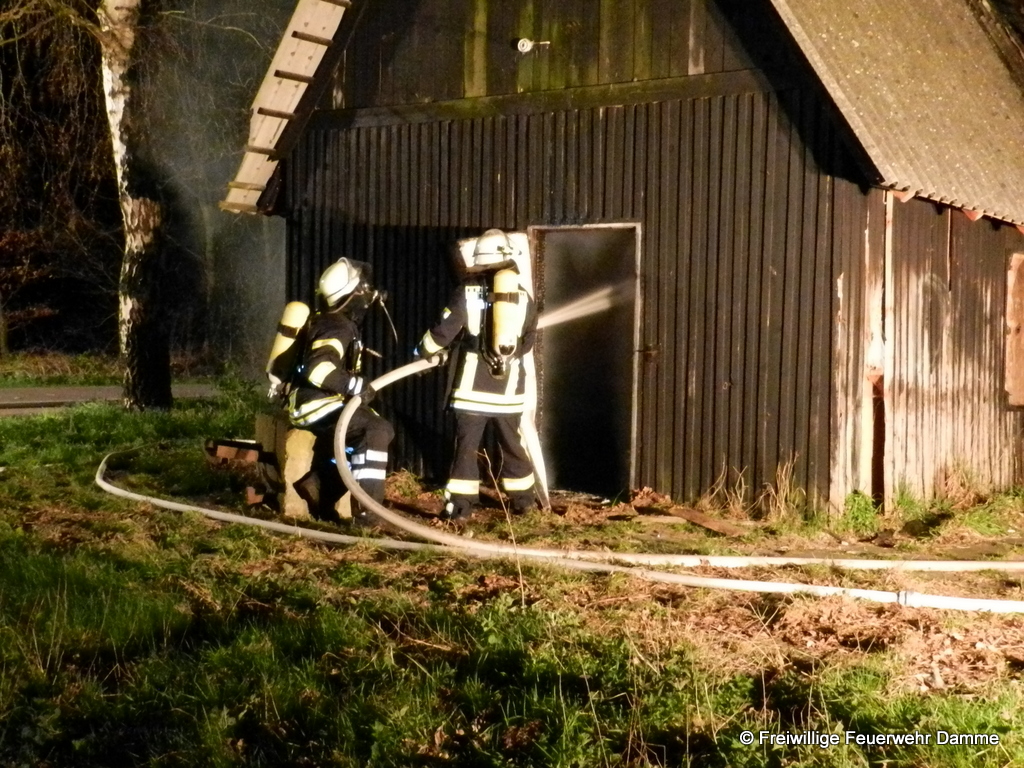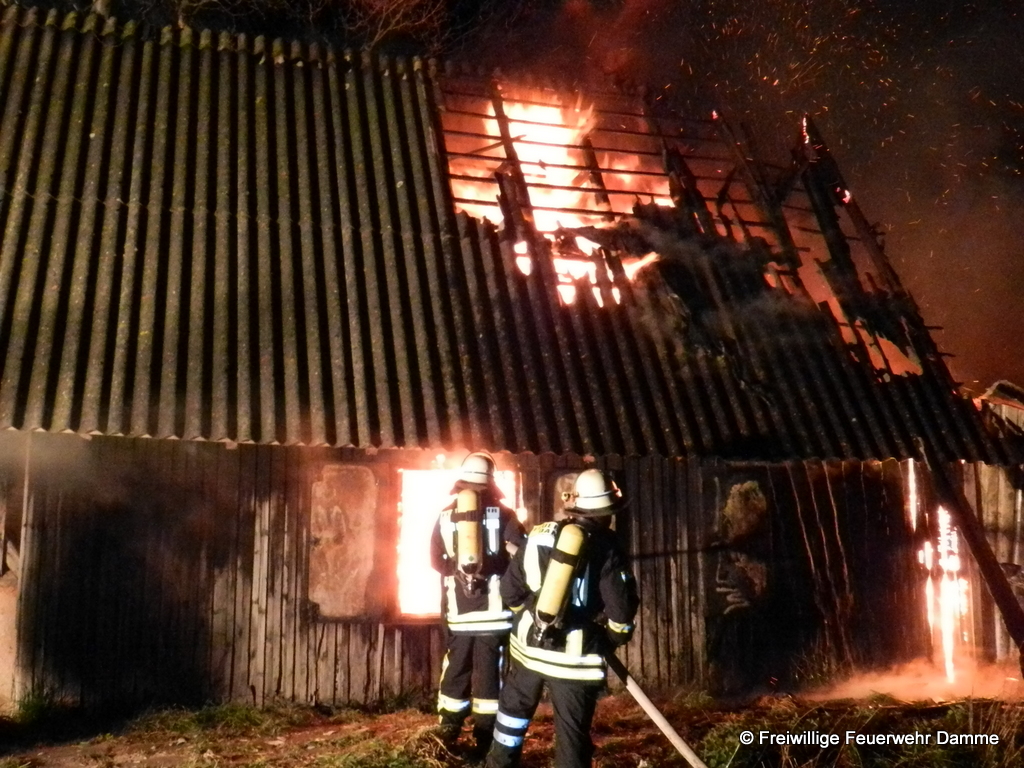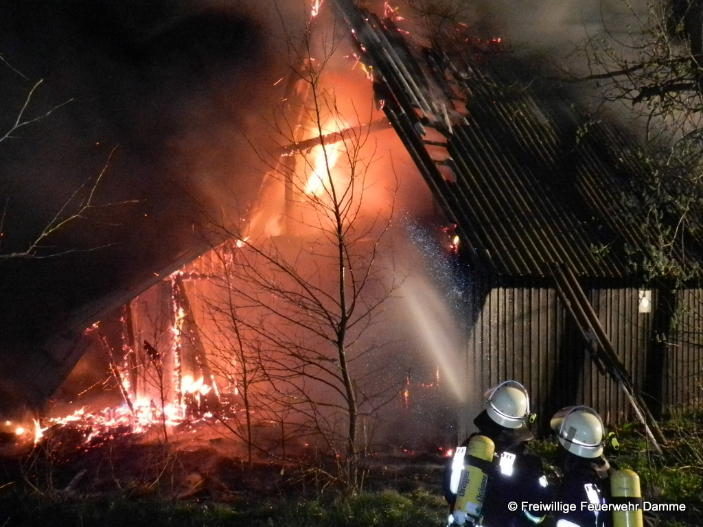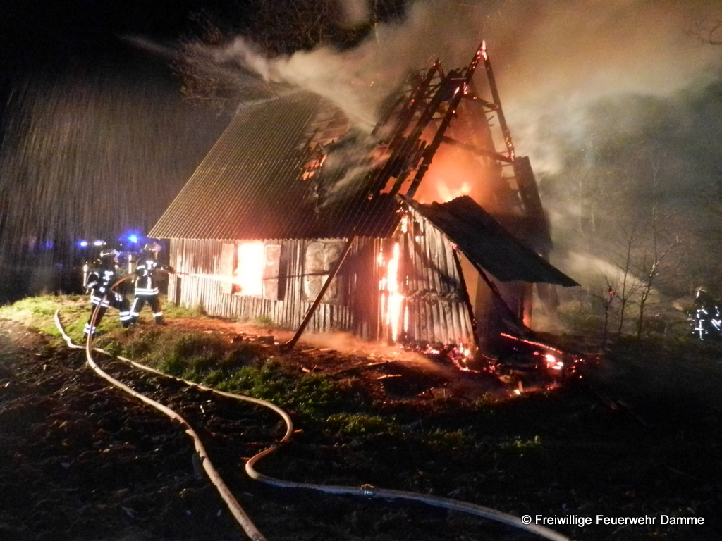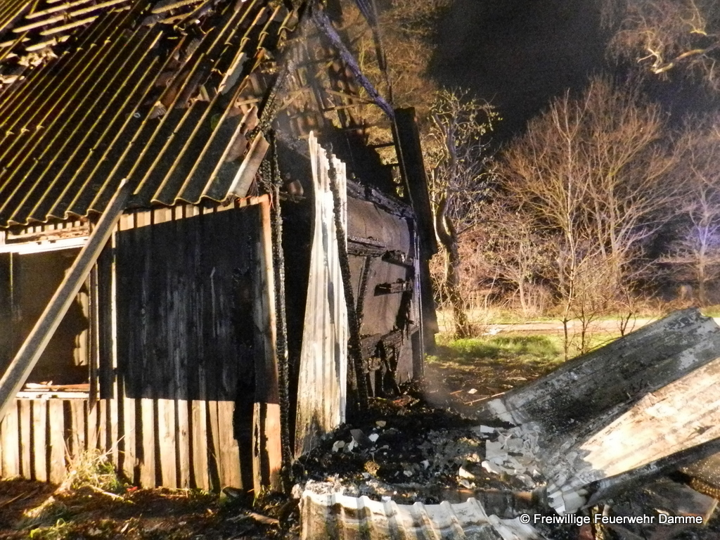 Um 01:12 wurde die Feuerwehr Damme zu einem Brandeinsatz in Sierhausen alarmiert. In der Nähe der Römerschanzen brannte eine ehemalige Partyhütte. Das Feuer breitete sich schnell über den Dachstuhl auf das gesamte Gebäude aus. Mit zwei Angrifftrupps wurde das Feuer von außen bekämpft. An dem leerstehenden Gebäude entstand Totalschaden. Als Brandursache kann Brandstiftung nicht ausgeschlossen werden. Die Kripo hat die Ermittlungen aufgenommen.