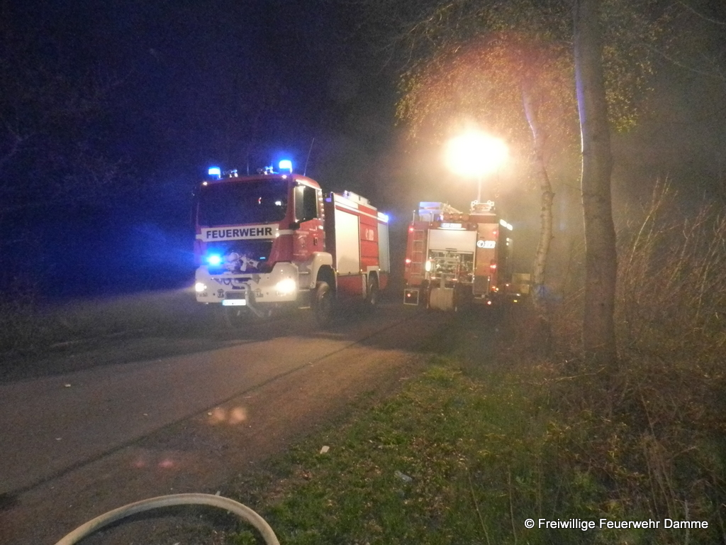 Im Einsatz: TLF 16/25, LF 16 TS, TLF 20/ 40 SL, ELW, MTF mit Materialanhänger, Polizei Damme