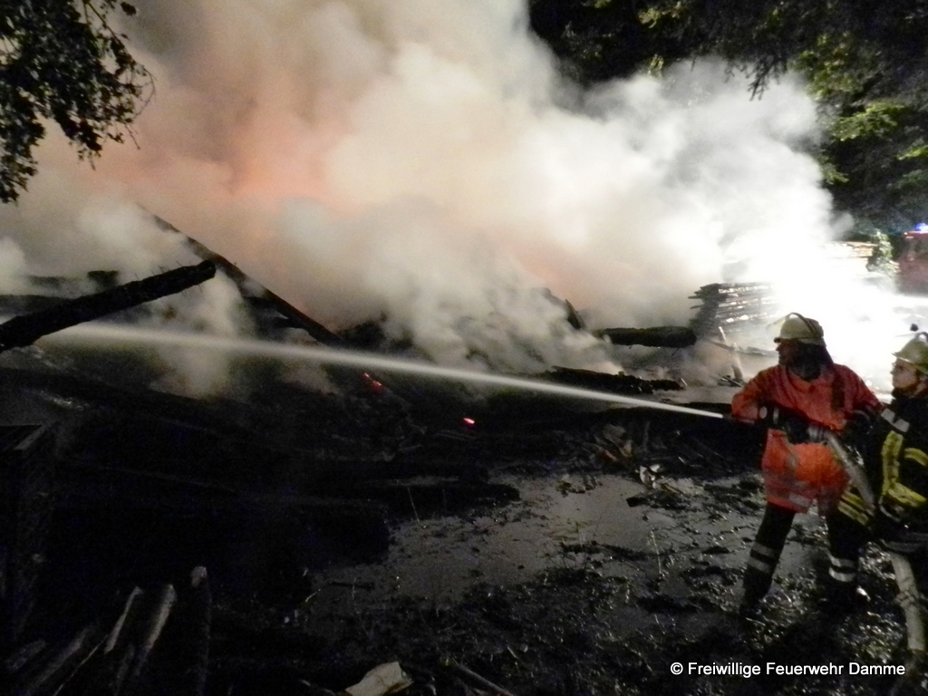 Um 00:08 wurde die Feuerwehr Damme zu einem Schuppenbrand an der Gramker Str. in Bexadde alarmiert. Beim Eintreffen der ersten Kräfte brannte eine ca. 40 x 15 Meter große Scheune in voller Ausdehnung. Da sich die Scheune allerdings in Grapperhausen auf Neuenkirchener Gebiet befand, wurde umgehend die Feuerwehr Neuenkirchen nachalarmiert. In der Scheune sowie unter einem Abdach war Brennholz und Schnittholz gelagert, was bereits lichterloh brannte. Zur Sicherstellung der Löschwasserversorgung wurden die Tanklöschfahrzeuge der Feuerwehren Holdorf, Fladderlohausen, Vörden, Borringhausen und Steinfeld alarmiert. Mit ihnen wurde ein Pendelverkehr von den Wasserentnahmestellen zur Einsatzstelle eingerichtet.