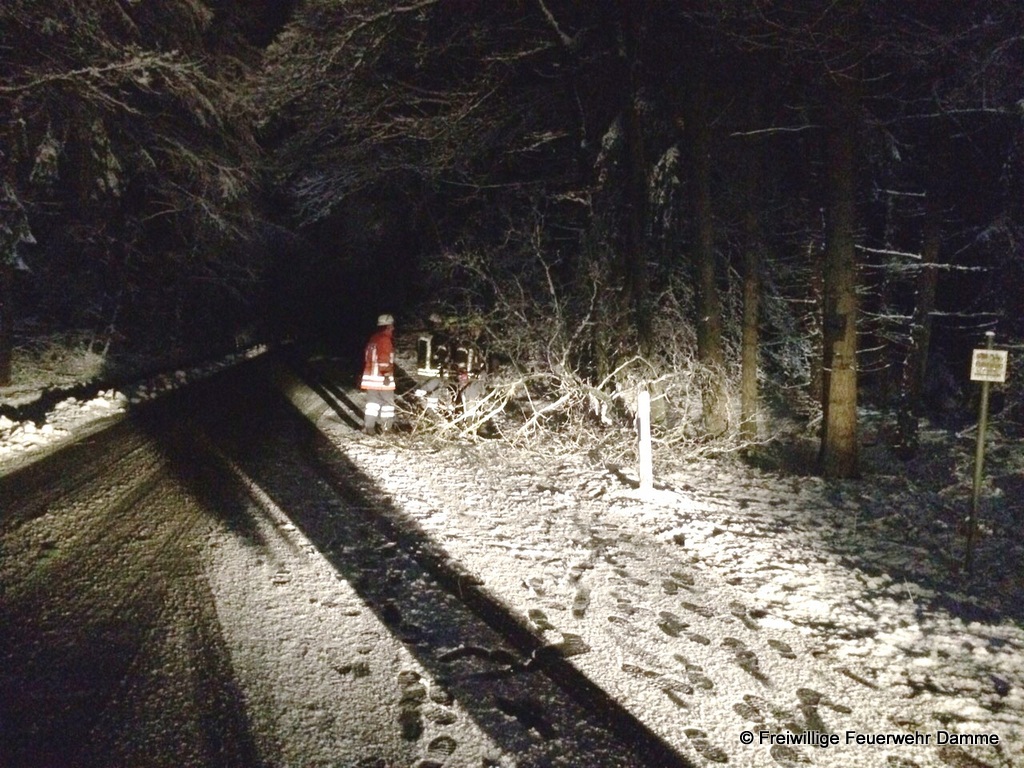 Um 06:34 wurde die Feuerwehr Damme zu einer technischen Hilfeleistung alarmiert. Auf der Steinfelder Strasse war aufgrund der Schneelast ein Ast von einem Baum abgeknickt und ragte in die Fahrbahn rein. Die Gefahrenstelle konnte von den Einsatzkräften rasch beseitigt werden.
