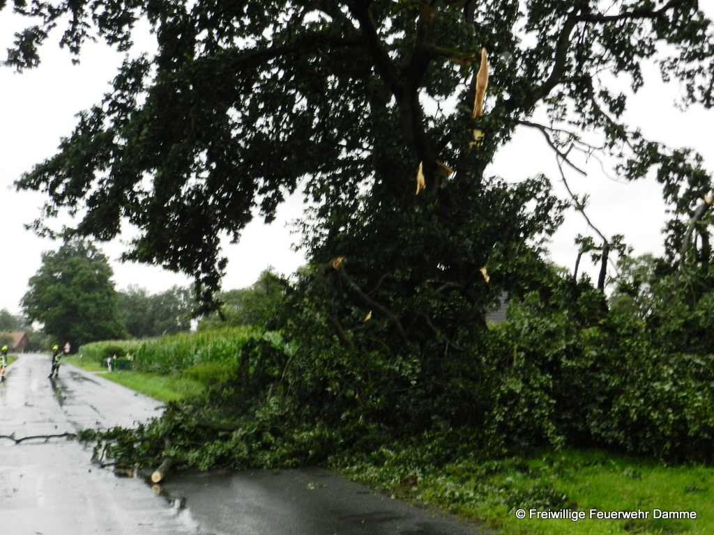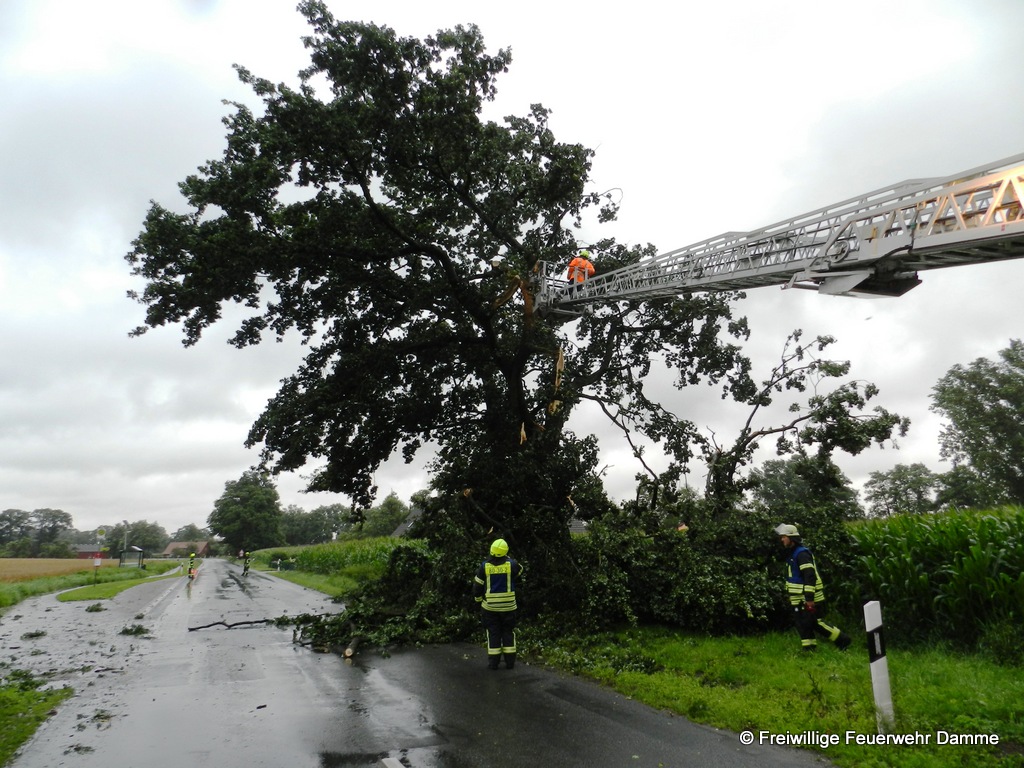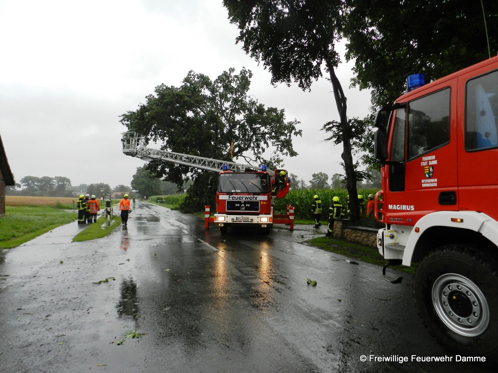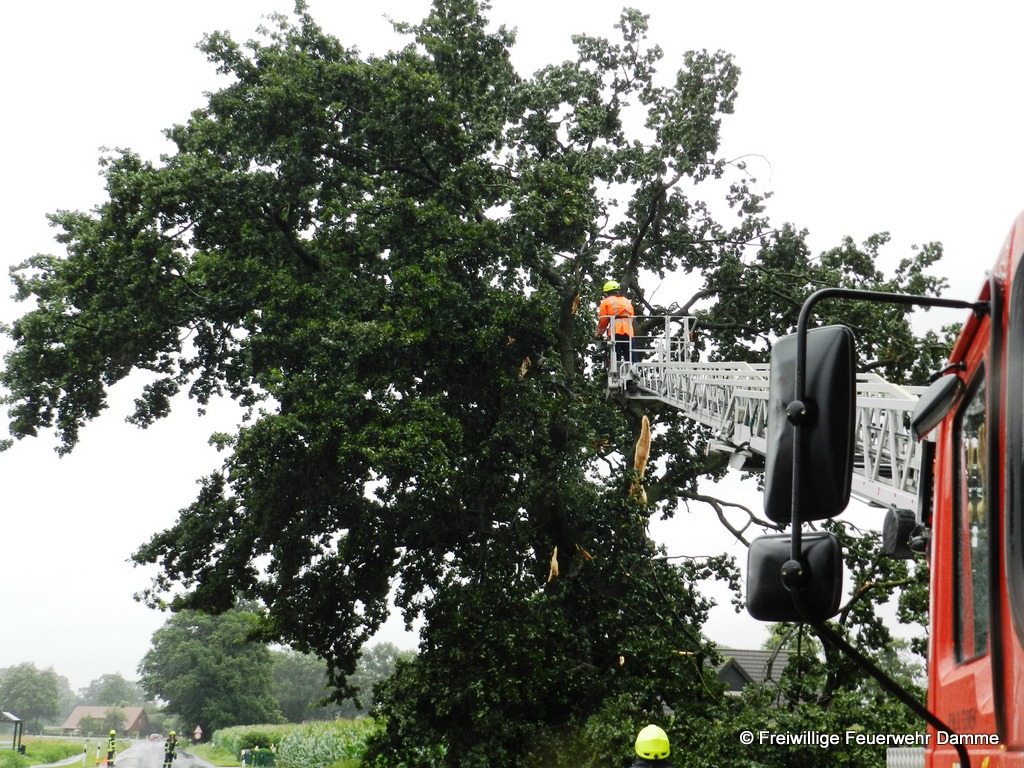 Um 19:17 wurde die Feuerwehr Damme abermals zu einer technischen Hilfeleistung alarmiert. Diesmal musste die Feuerwehr Borringhausen mit der Drehleiter unterstützt werden. An der Kreisstraße in Kemphausen drohten aus einer großen Eiche Äste auf die Fahrbahn zu fallen. Von der Drehleiter aus wurden diese entfernt.