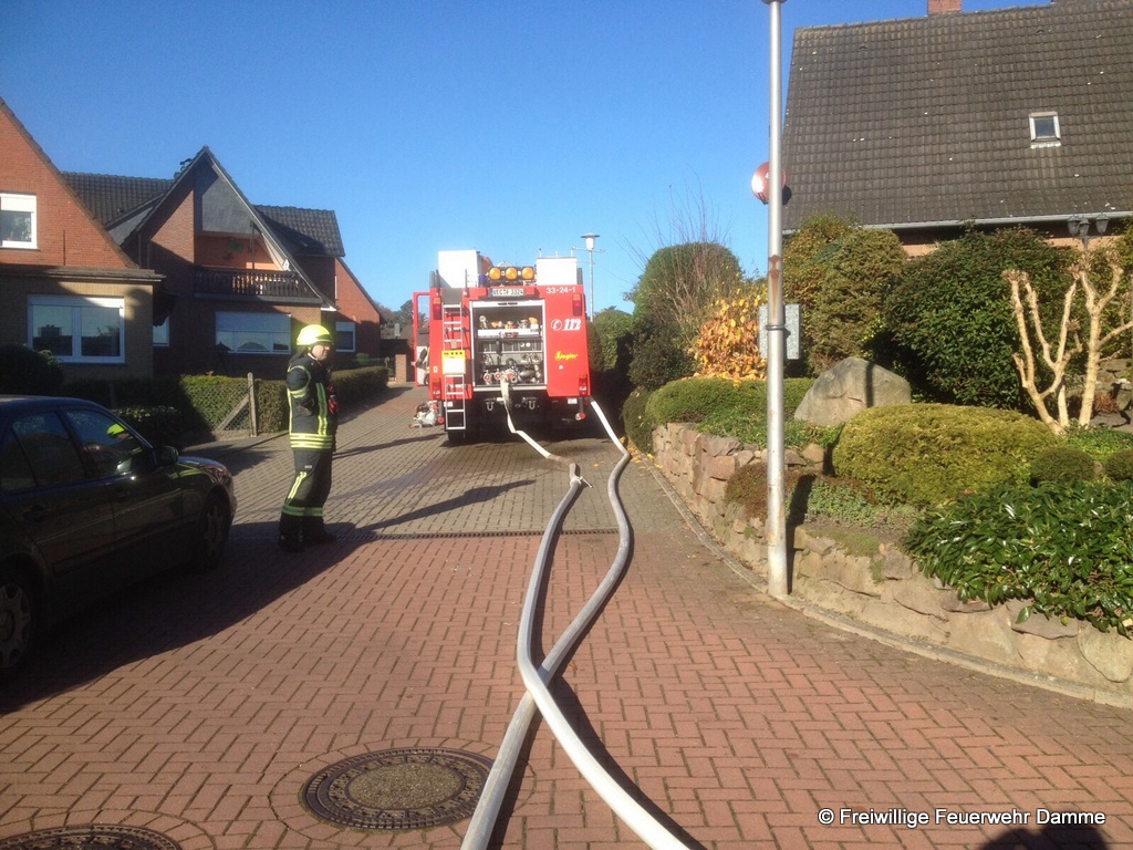 Im Einsatz: PKW OrtsBM, TLF 16/25, LF 16 TS, DLK 23/ 12, ELW 1, RTW 1 Malteser Damme, Polizei Damme