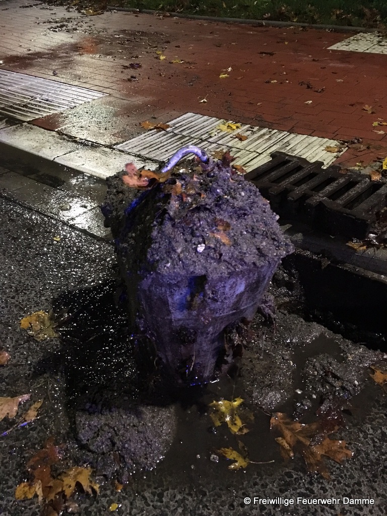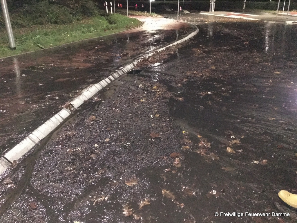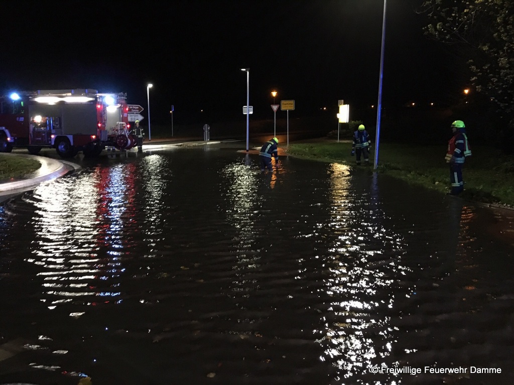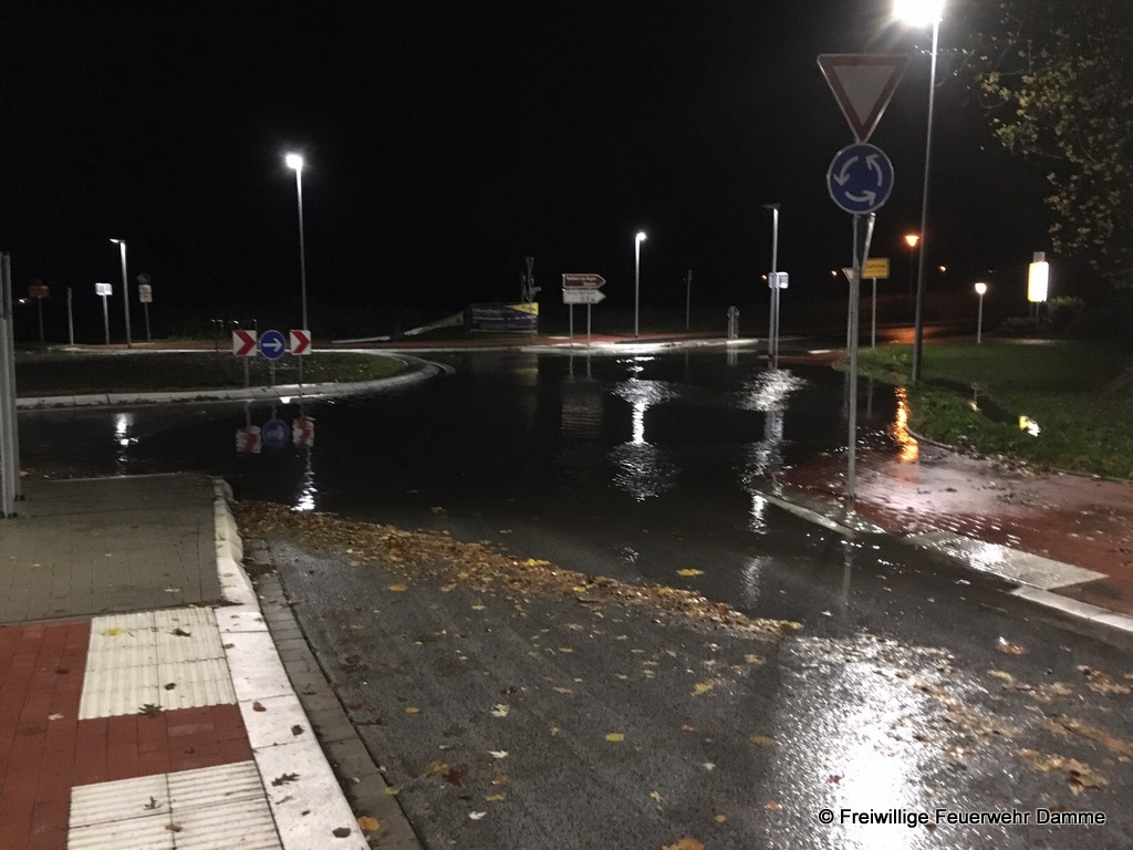 Um 22:01 wurde die Feuerwehr Damme zu einer technischen Hilfeleistung auf der Steinfelder Str. alarmiert. Auf Grund des Starkregens war der Kreisel überflutet worden. Von den Einsatzkräften wurden die Gullys geöffnet, damit die Wassermassen ablaufen konnten. Außerdem wurde ein umgewehtes Werbebanner am Kreisel wieder aufgestellt. Anschließend fuhren die Einsatzkräfte zur Holdorfer Str. Ecke Grambker Str. Auch dort war die Fahrbahn überflutet worden. Hier wurden ebenfalls die Gullys gezogen, um die Wassermassen abfließen zu lassen. Danach wurde noch in der Straße Am Freibad ein Gully geöffnet. Dort war es auch zu einer Überschwemmung gekommen.