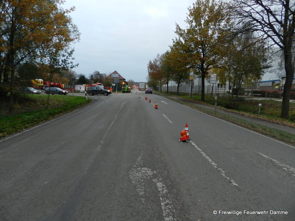 Im Einsatz: PKW OrtsBM, TLF 16/ 25, LF 16 TS, TLF 20/ 40 SL, ELW 1, FF Borringhausen, FF Steinfeld, Polizei Damme.