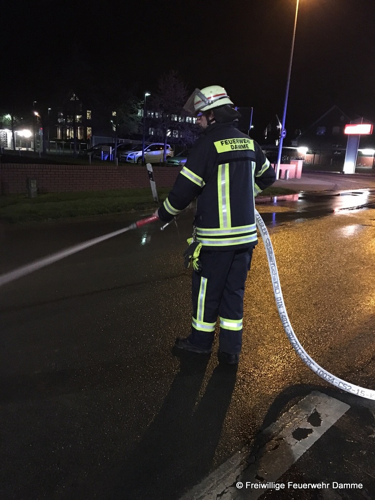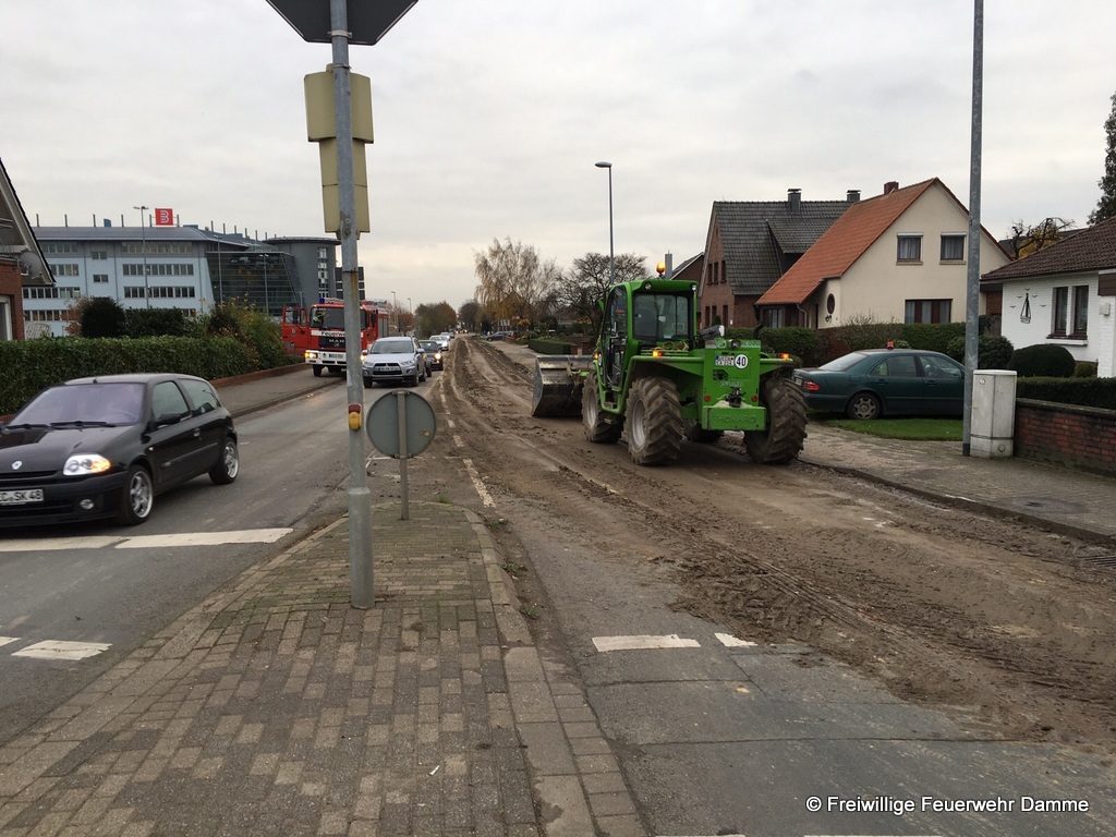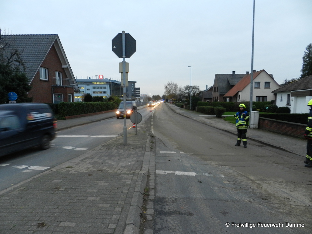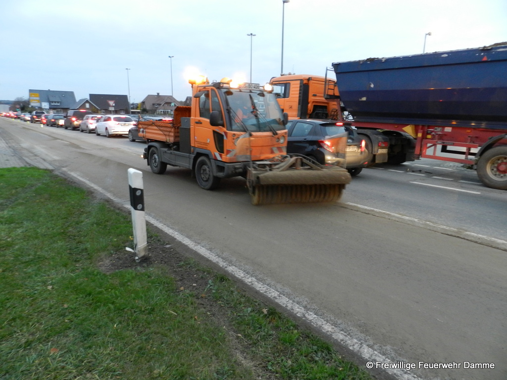 Um 14:45 wurde die Feuerwehr Damme zu einer technischen Hilfeleistung auf der Hunteburgerstr. alarmiert. An einem Auflieger eines LKW hatte sich während der Fahrt die hintere Klappe geöffnet. Daraufhin hatte sich die Ladung, die aus einem Gemisch aus Sand, Lehm und Steinen bestand, auf einer Länge von ca. 400 Metern auf der Hunteburgerstr. und dem Südring verteilt. Die Feuerwehr sicherte die Einsatzstelle ab. Zusammen mit der Kreisstraßenmeisterei, dem Bauhof und einem Privatunternehmen wurde die Straße erst mit technischem Gerät grob gereinigt. Danach wurden von der Feuerwehr die Reste mit Wasser von der Fahrbahn entfernt. Dazu wurde die Feuerwehr Borringhausen sowie das TLF 24/ 50 der Feuerwehr Steinfeld zur Unterstützung nachalarmiert. Die Straße war während der gesamten reinigungsarbeiten voll gesperrt.