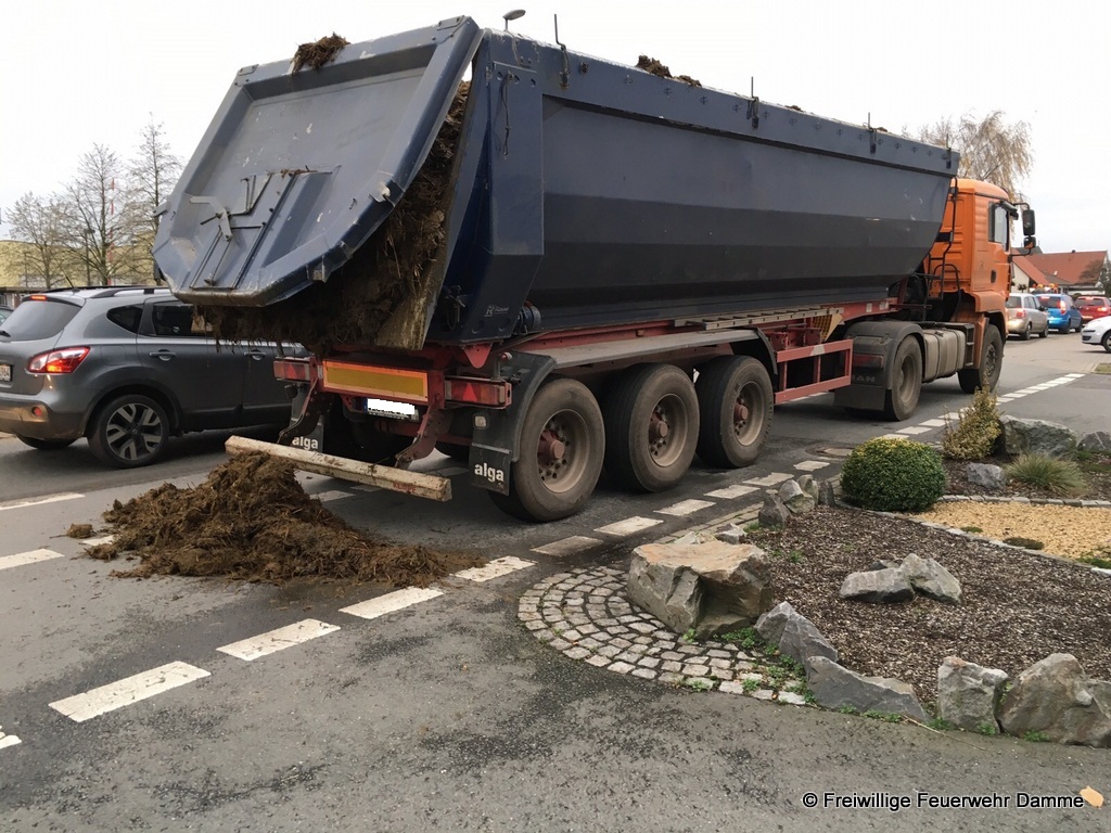 Während der Einsatzes verlor ein LKW, desen hintere Klappe sich auch geöffnet hatte, auf der Gegenfahrbahn auf der Hunteburgerstr. in Höhe der Firma Boge Ladung die aus Mist bestand. Auch diese verunreinigung wurde rasch beseitigt.