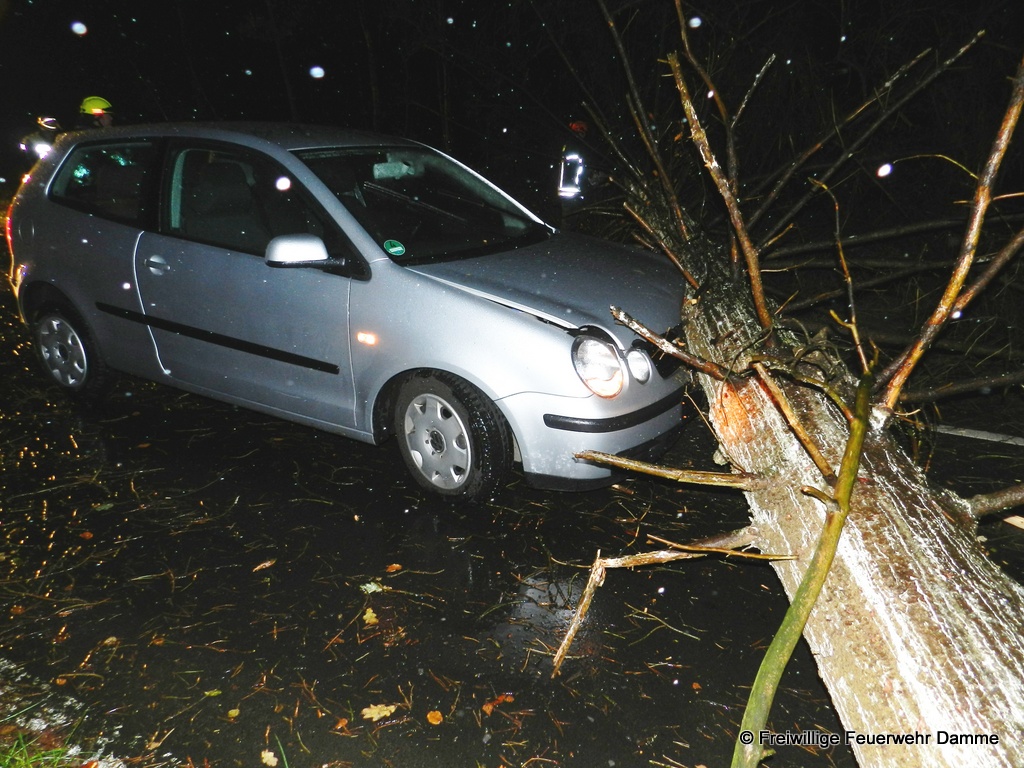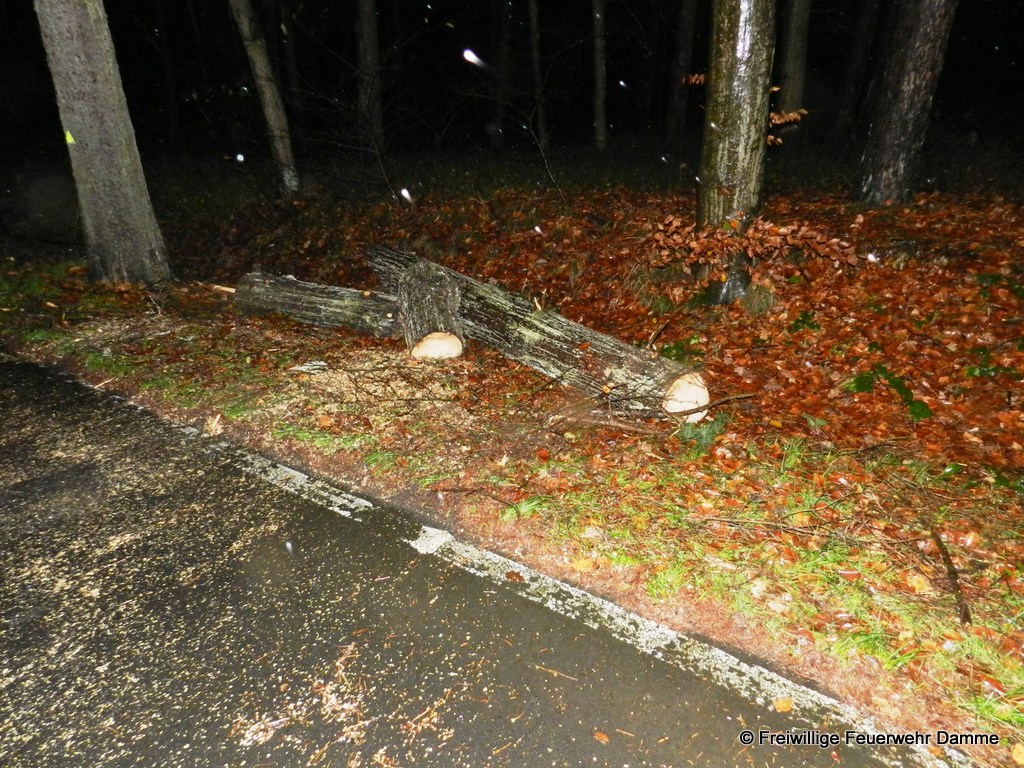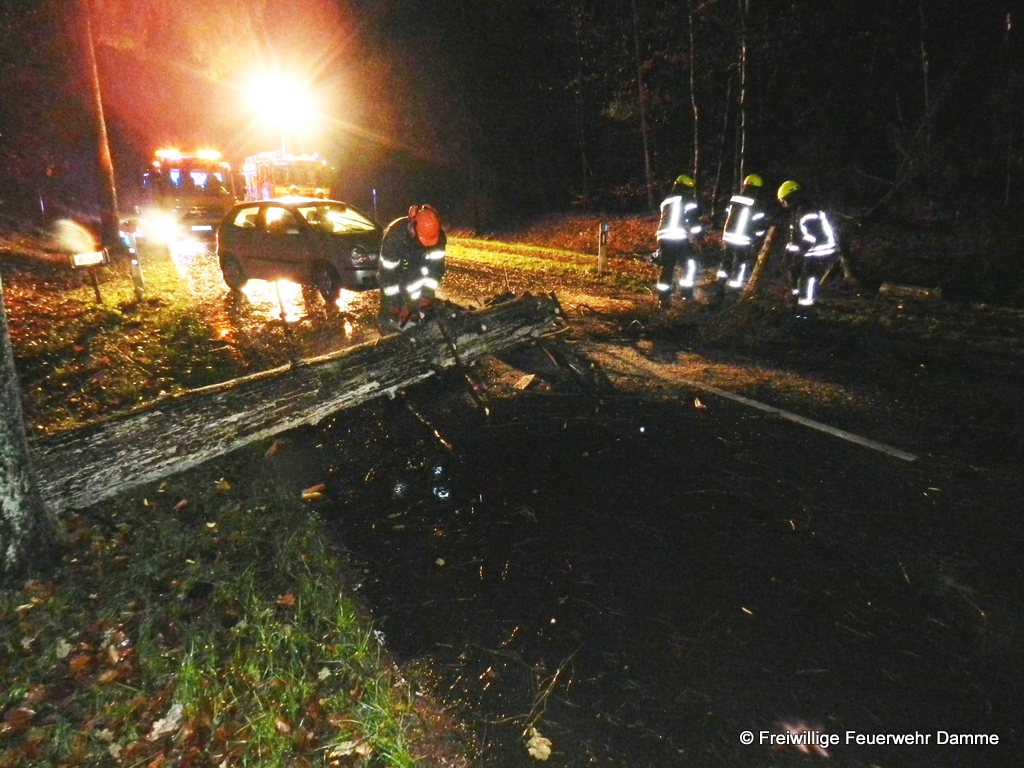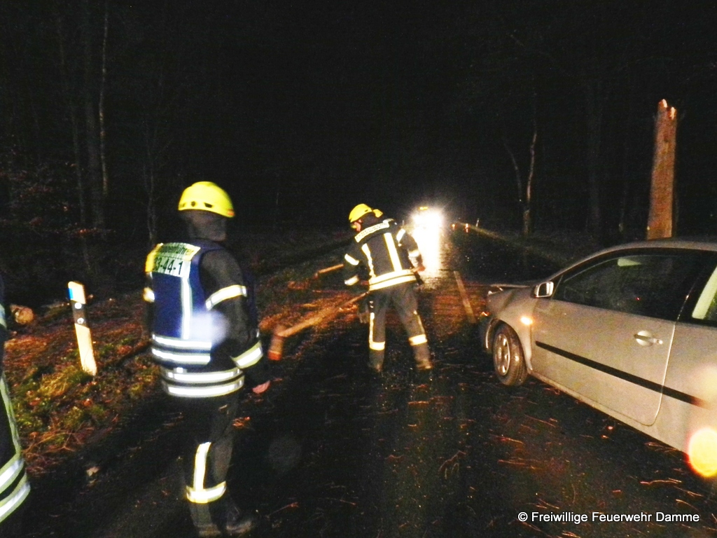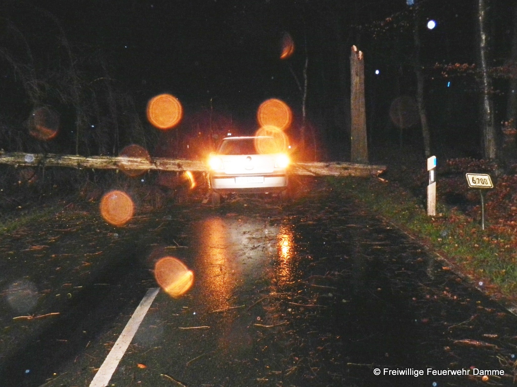 Um 05:50 wurde die Feuerwehr Damme zu einer technischen Hilfeleistung nach Verkehrsunfall auf der Gramker Straße in der Bexadde alarmiert. Auf Grund des Sturmes war ein Baum in ca. 3 Metern Höhe abgebrochen und lag quer über der Fahrbahn. Diese erkannte ein mit 3 Personen besetzter PKW zu spät und fuhr in das Hindernis hinein. Zum Glück wurde niemand der Insassen dabei verletzt. Allerdings entstand am PKW erheblicher Sachschaden. Mittels Motorkettensäge wurde der Baum beseitigt. Anschließend wurde noch die Fahrbahn gereinigt.