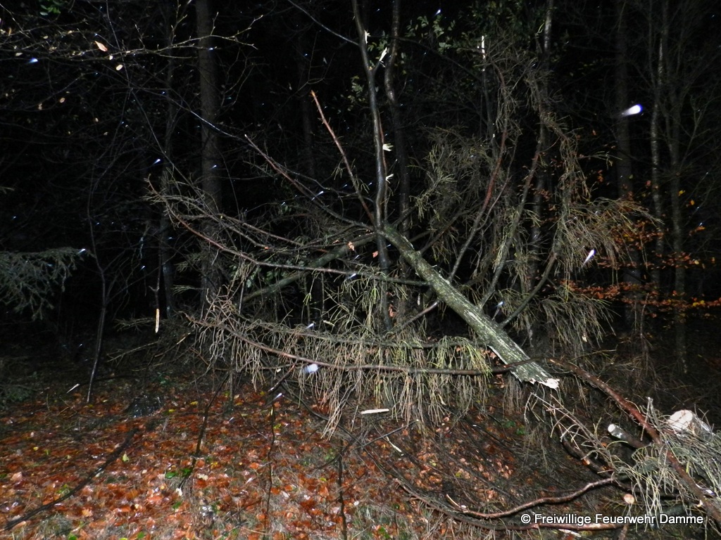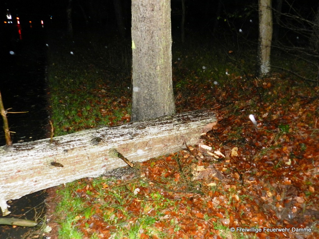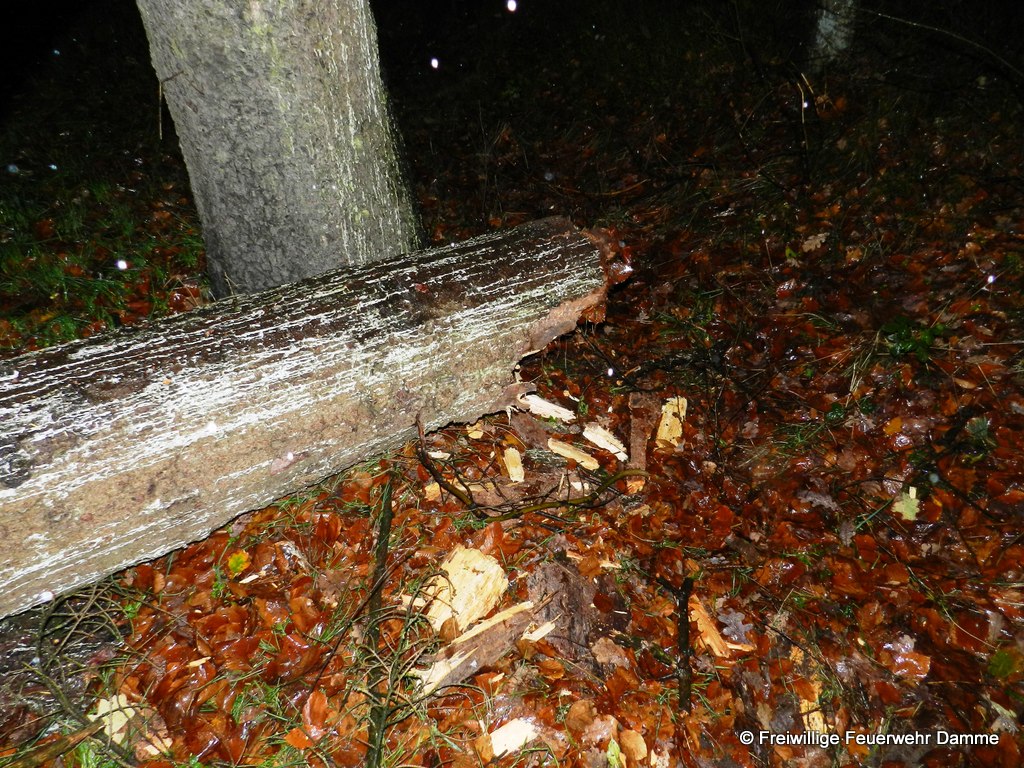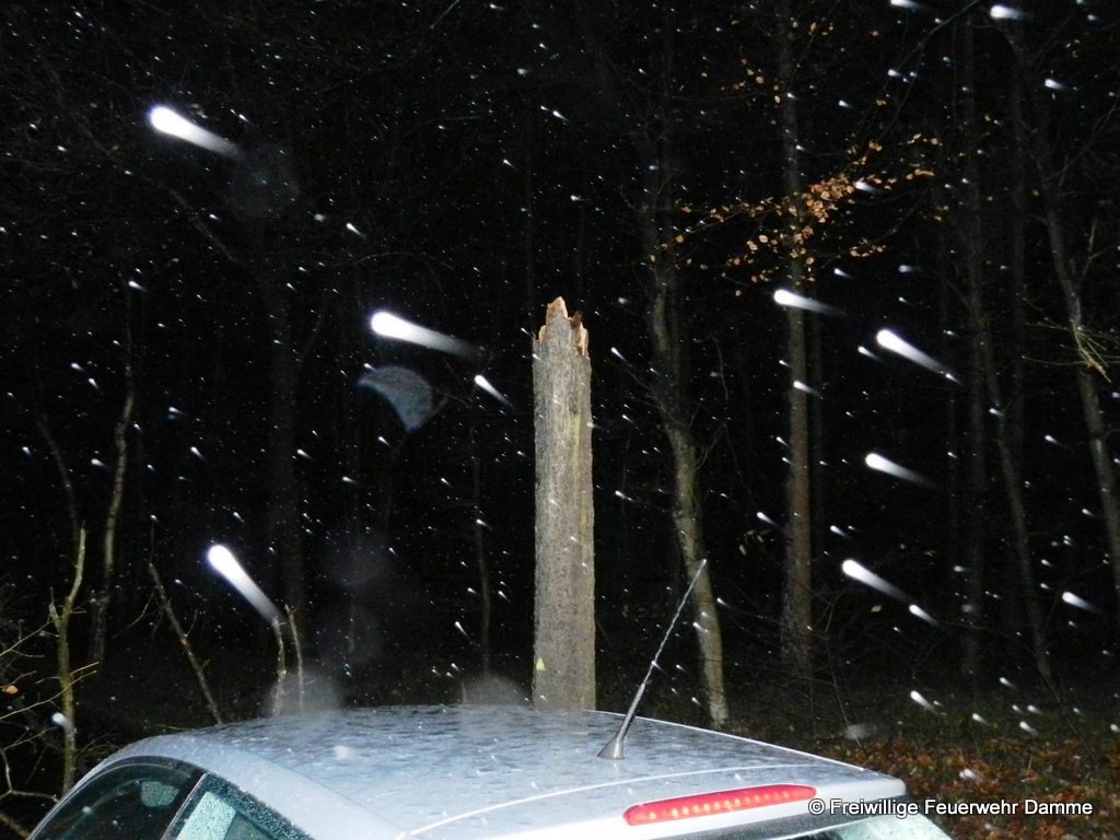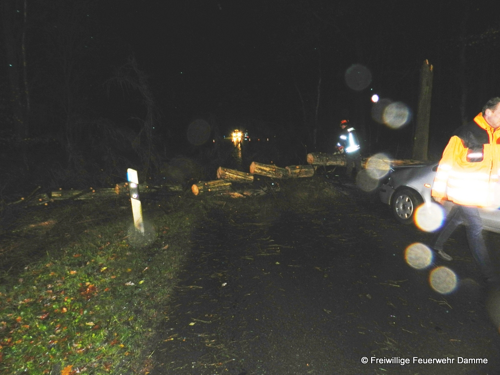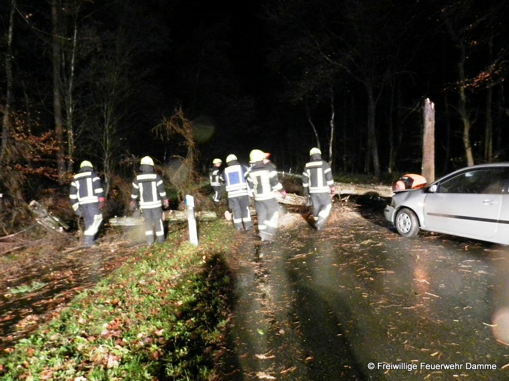 Um 05:50 wurde die Feuerwehr Damme zu einer technischen Hilfeleistung nach Verkehrsunfall auf der Gramker Straße in der Bexadde alarmiert. Auf Grund des Sturmes war ein Baum in ca. 3 Metern Höhe abgebrochen und lag quer über der Fahrbahn. Diese erkannte ein mit 3 Personen besetzter PKW zu spät und fuhr in das Hindernis hinein. Zum Glück wurde niemand der Insassen dabei verletzt. Allerdings entstand am PKW erheblicher Sachschaden. Mittels Motorkettensäge wurde der Baum beseitigt. Anschließend wurde noch die Fahrbahn gereinigt.