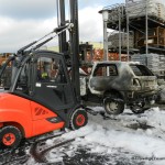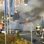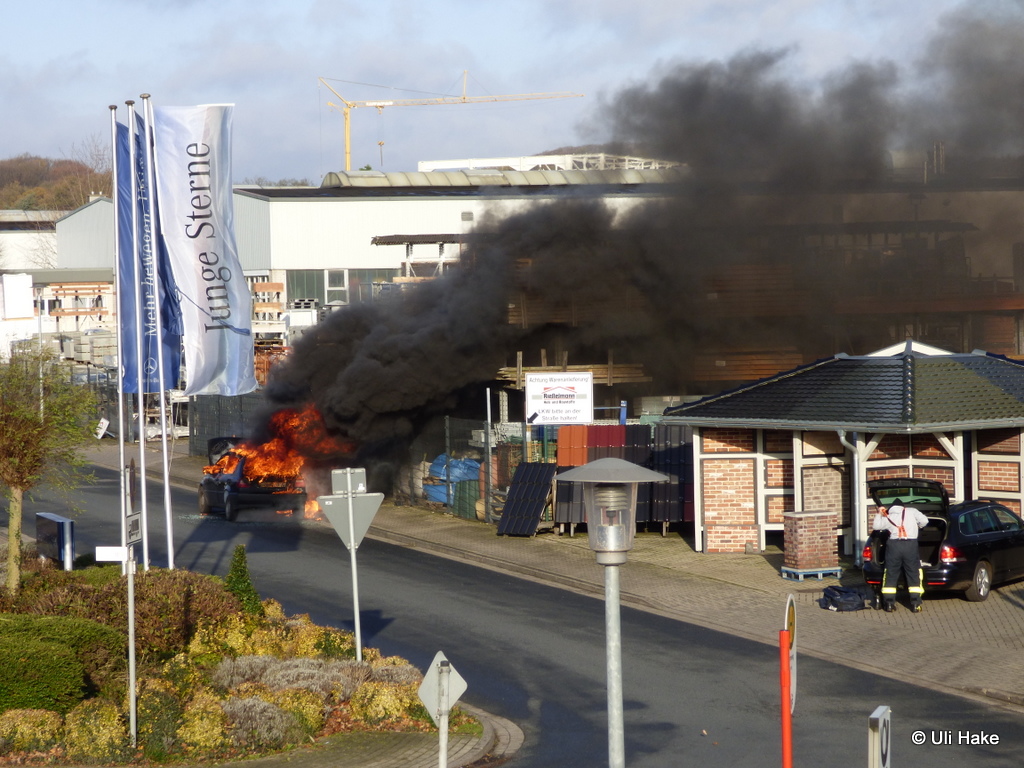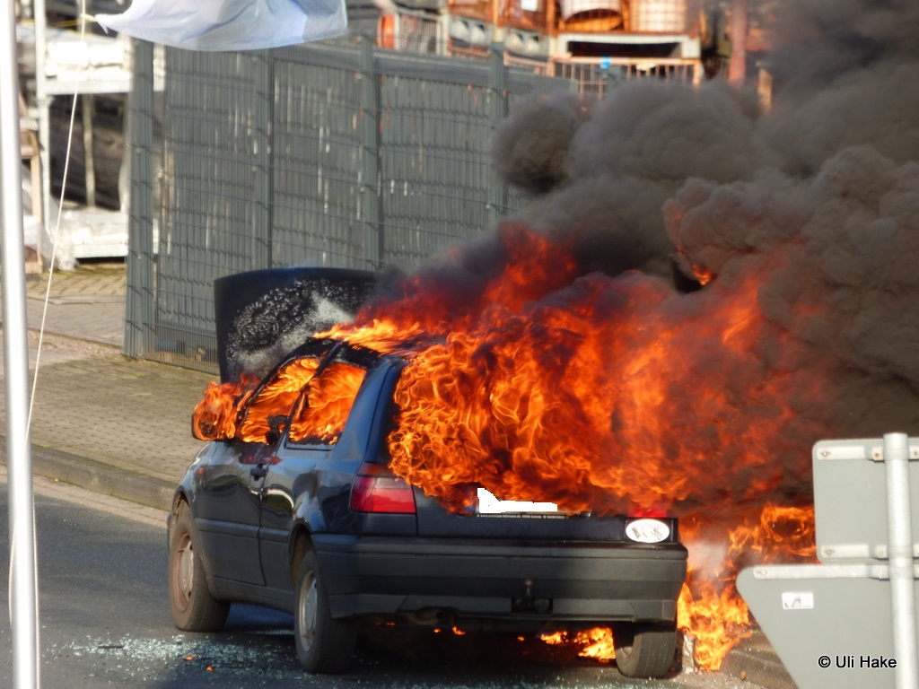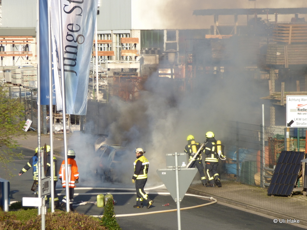 Von einem Trupp unter Atemschutz wurde sofort eine Brandbekämpfung und Riegelstellung zur angrenzenden Firma eingeleitet. Dadurch wurde eine schnelle Reduzierung der Hitzestrahlung erzielt und ein Übergreifen der Flammen aufs Baustofflager verhindert. Nach Aufbau eines Schaumangriffes wurde der PKW abschließend abgelöscht. Allerdings entstand am PKW Totalschaden.