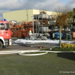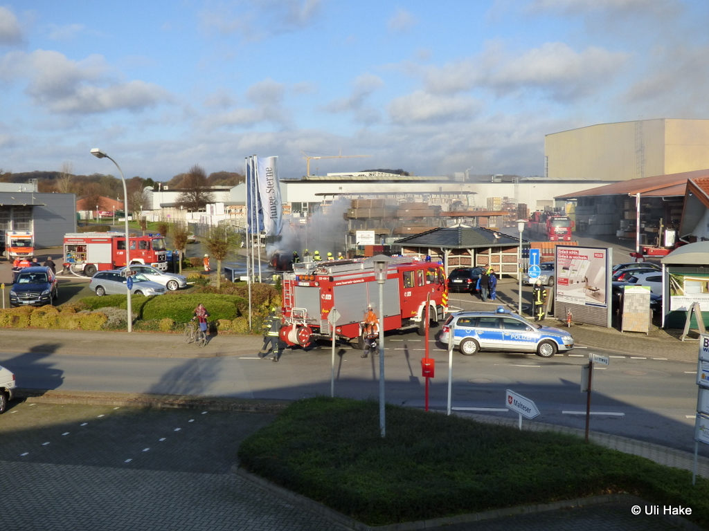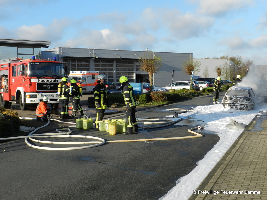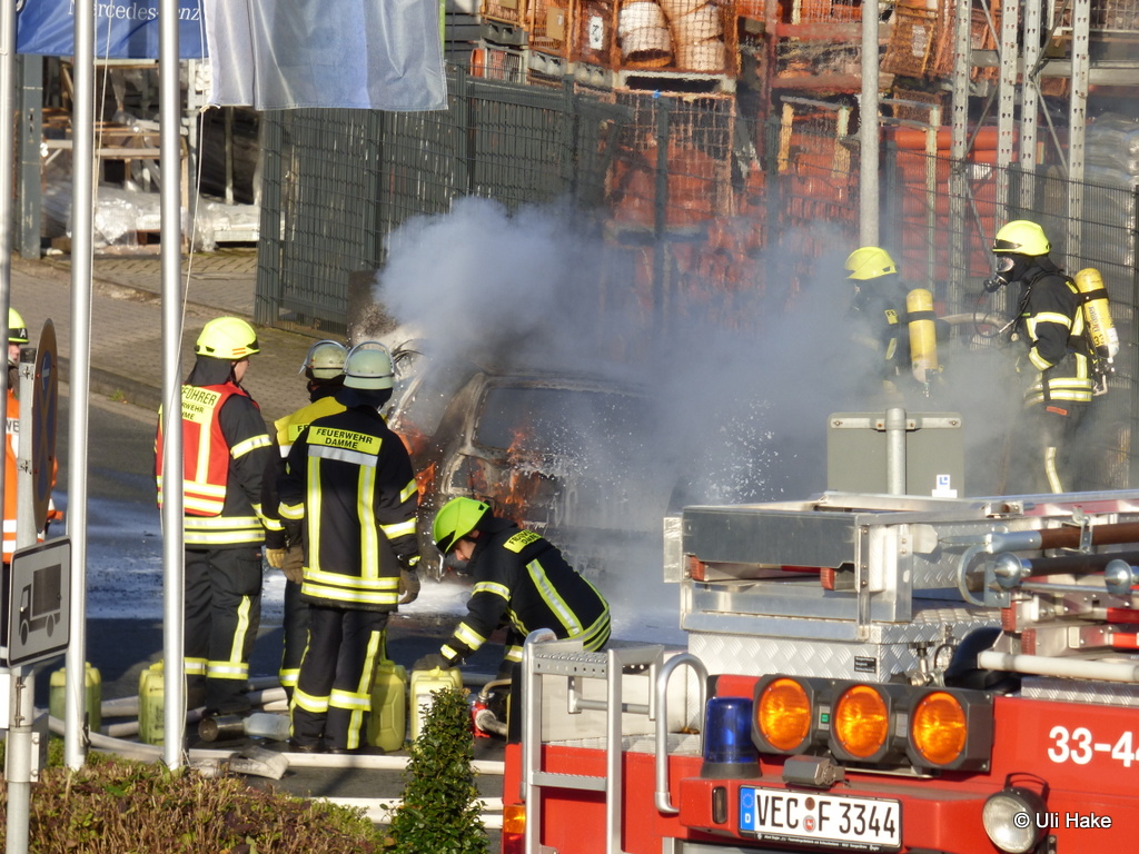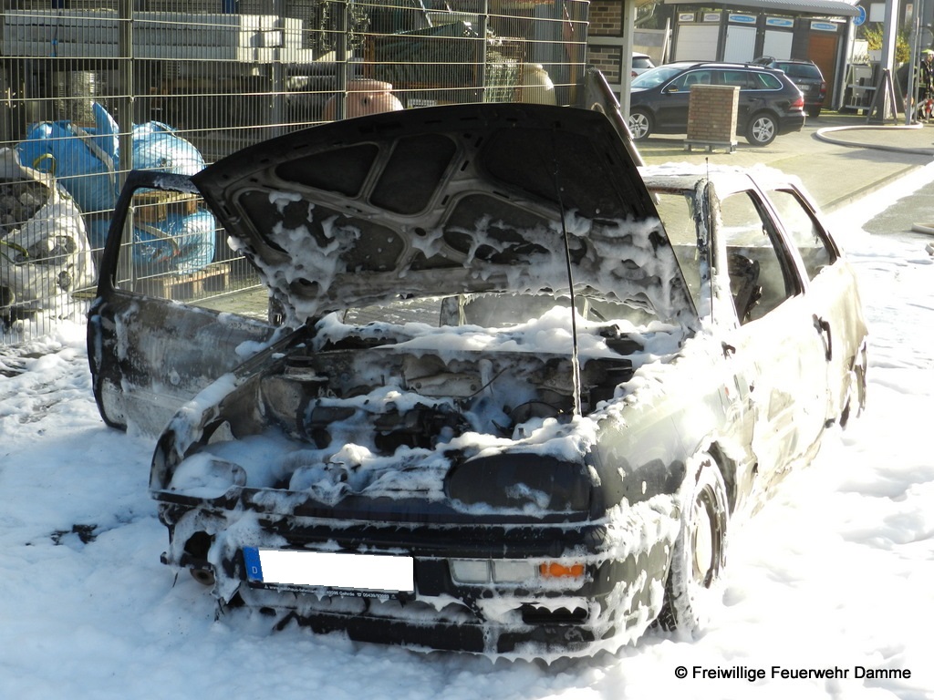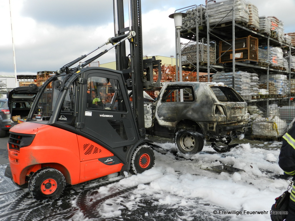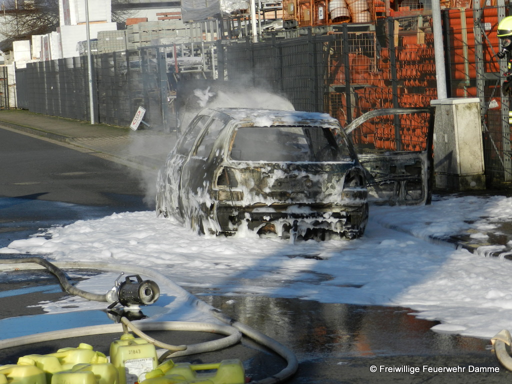 Um 10:24 wurde die Feuerwehr Damme zu einem PKW Brand auf dem Turmweg alarmiert. Dort war ein VW Golf aus ungeklärter Ursache in Brand geraten. Beim Eintreffen des Einsatzleiters befand sich der PKW schon in Vollbrand. Da das Fahrzeug genau neben dem Außenlagers einer Baustoffhandlung brannte und das Feuer auf Grund der ernormen Hitzestrahlung drohte, sich auf das Baustofflager auszubreiten, wurde das Alarmstichwort sofort auf Feuer 2 erhöht und weitere Einsatzkräfte alarmiert.